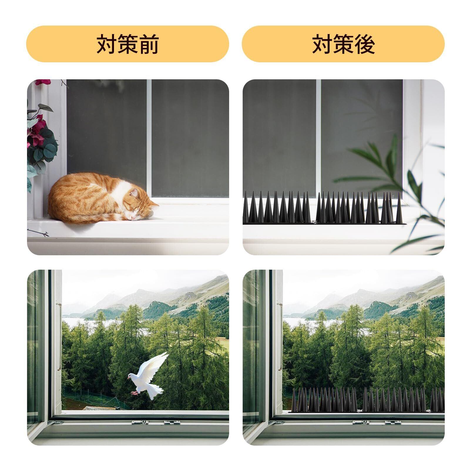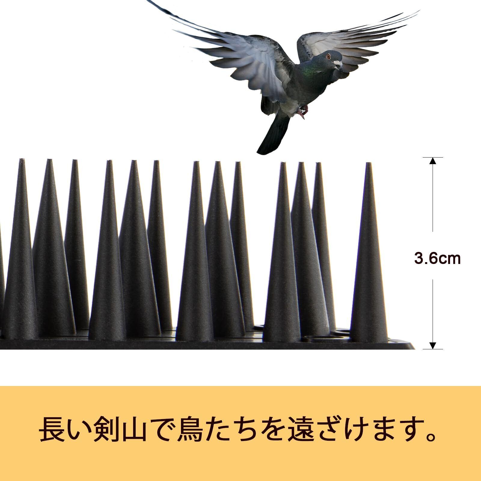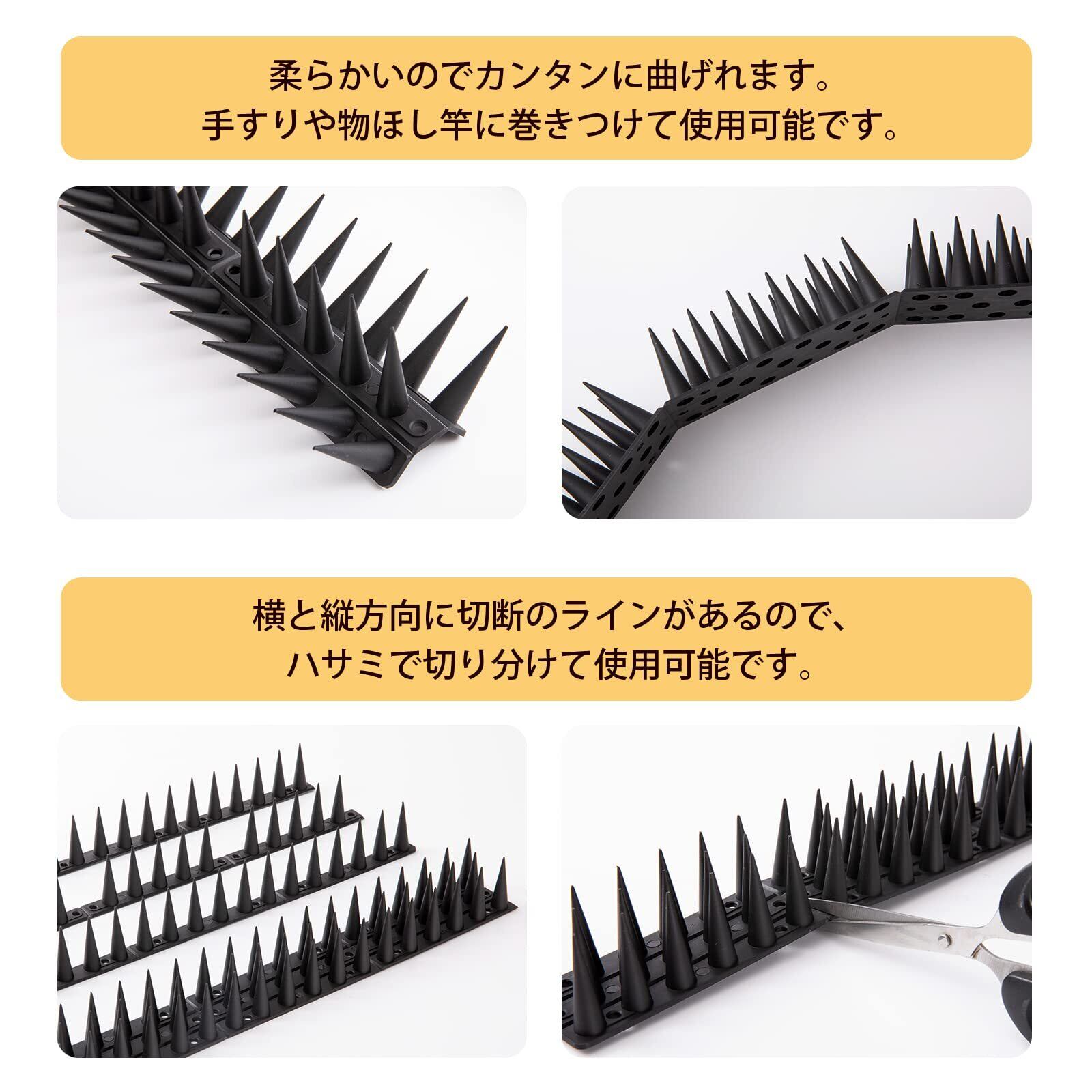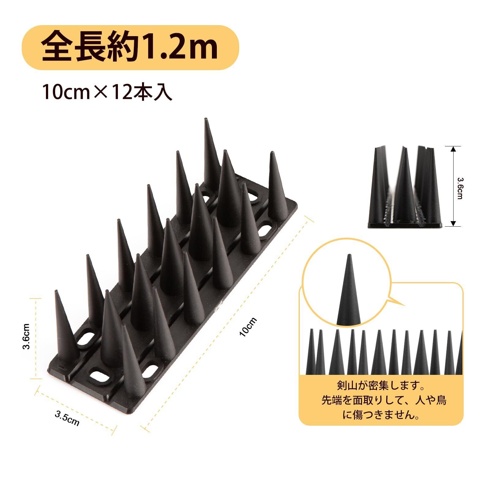 [幅広い用途] 1シートは高さ36mm×幅35mm×長さ100mmです。100mm×12本入りです。スパイクが長くて、幅も広げたので、鳩だけでなく野良猫、野獣よけにも効果的です。広い範囲で防鳥や防獣できます。ウッドフェンスと同色なブラウン、合わせやすい黒色が揃われます。家の物干し竿 、柵、看板、ベランダ、エアコンの室外機、バルコニー、屋根、軒下、手すり、窓のひさしなど鳥が止まりやすい場所。また防犯対策、立入禁上の場所にも最適です。