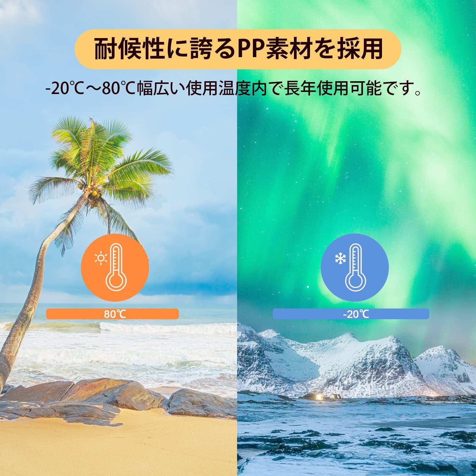 [耐候性・耐久性抜群] 汎用樹脂の中で、最高の耐熱性を誇る高品質PP材を採用し、強度が高く、耐薬品(酸、アルカリを含む)性に優れ、吸湿性が無く、金属のように錆びたり、強い光で変形したりしません。常に強い紫外線にさらされる上、-20℃~80℃の低温、高温、豪雨、雪等過酷な環境でも長く使用可能で、メンテナンスフリーで経済的です。