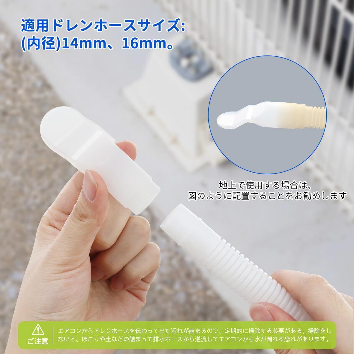 【適用サイズ】:ドレンホースキャップは柔軟性もあり、ほとんどのサイズの室外機ドレンホースに適している。適用ドレンホースサイズ:(内径)14mm、16mm。※注意:購入前に防虫ドレンキャップサイズとご自宅のドレンホースの内径の大きさを確認してください。