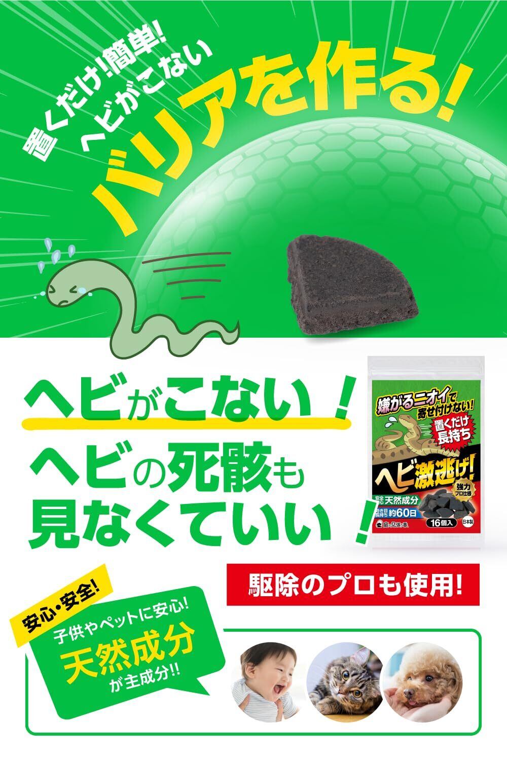 【置くだけ簡単・研究期間30年の成果】家の周り、花壇、塀や石垣の上や隙間にポンッと置くだけ。誰でも・簡単に・すぐ設置できます。固形の蛇よけ剤なので、蛇よけ効果の持続時間が長くなり、雨風にも強く、簡単に移動できます。害虫獣駆除の専門業者との共同研究から、ヘビが嫌がる有効成分を特定し商品化。ヘビ被害対策用に開発された強力なへびよけ剤。忌避剤実験でも確実な効果が実証。決して手抜きをしない正直なプロ用品質で、ご家庭でお困りの声を製品開発に反映しました。イモリ・ヤモリにも効果絶大です。