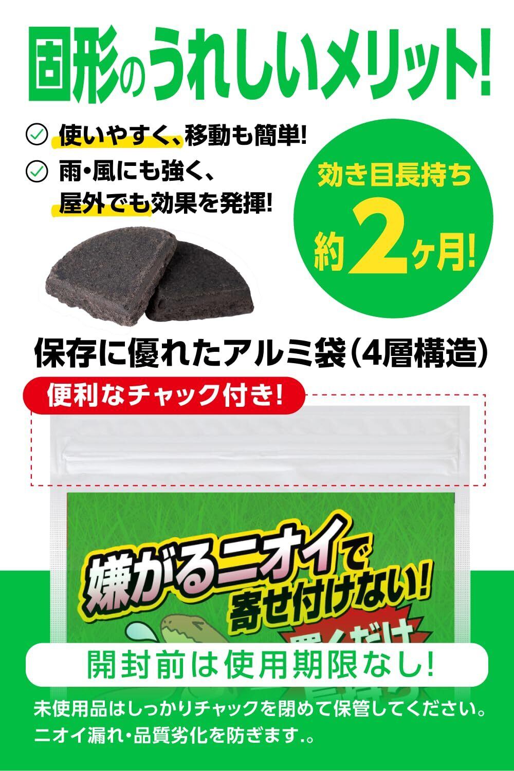 【効果長持ち2ヶ月・ワイドな効き目0.5〜1m/個】固形なので雨・風に強く、約2ヶ月間しっかり効果が持続。ワイドな効き目で、約0.5〜1mと広範囲にニオイが拡散します。設置間隔を"狭く"するとより効果が期待できます。未開封時は使用期限がないので、長期保存可能です。