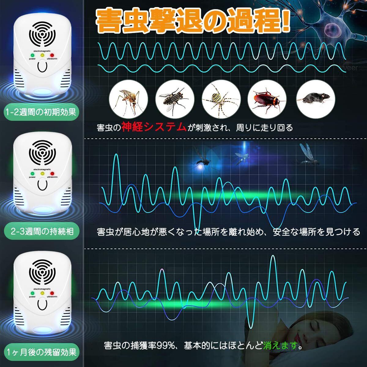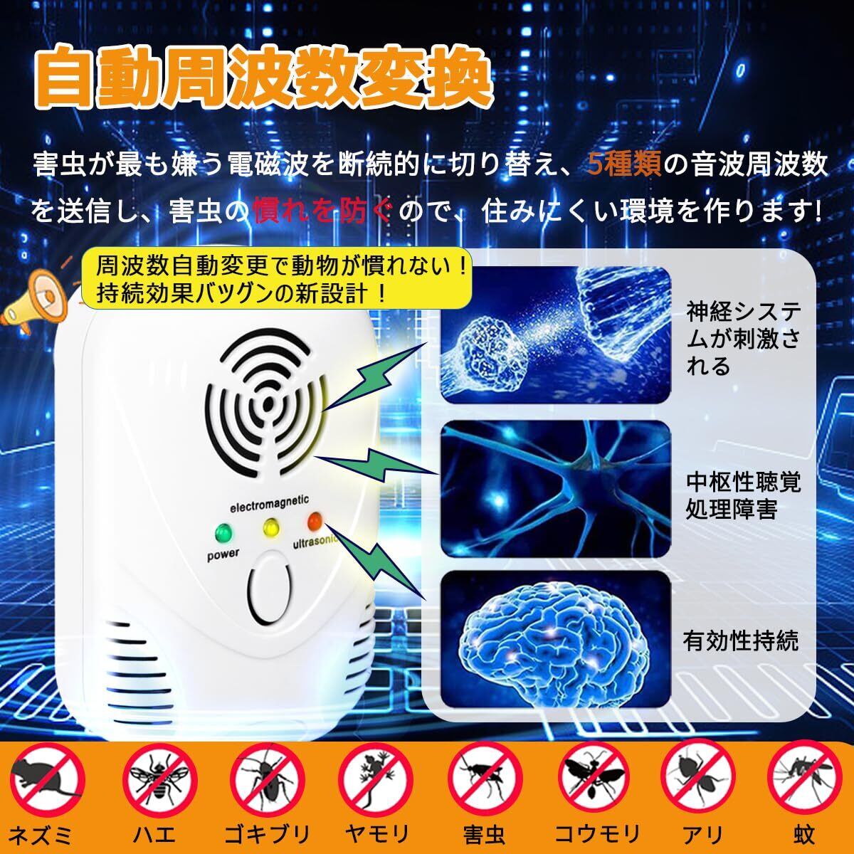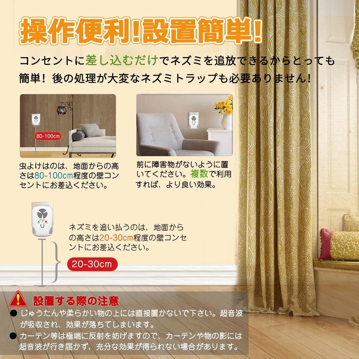 【駆除原理】電子超音波技術の更新によって、本商品は最先端のマイコン制御原理を採用し、電磁波+5種類超音波+圧力波の周波数パルス音波を発信することで暗い場所に隠れているネズミなどの害虫は強制的に出てきます。蚊、アブラムシ、クモ、ナンキンムシ、ゴキブリ、ネズミ、ノミ、アリ、ダンゴムシ、ミバエなどの害虫の聴覚および神経系を破壊し、不快感を与えて家から追い払わします。注:本製品は屋内害虫の忌避を目的としたものであり、殺虫効果はありません。