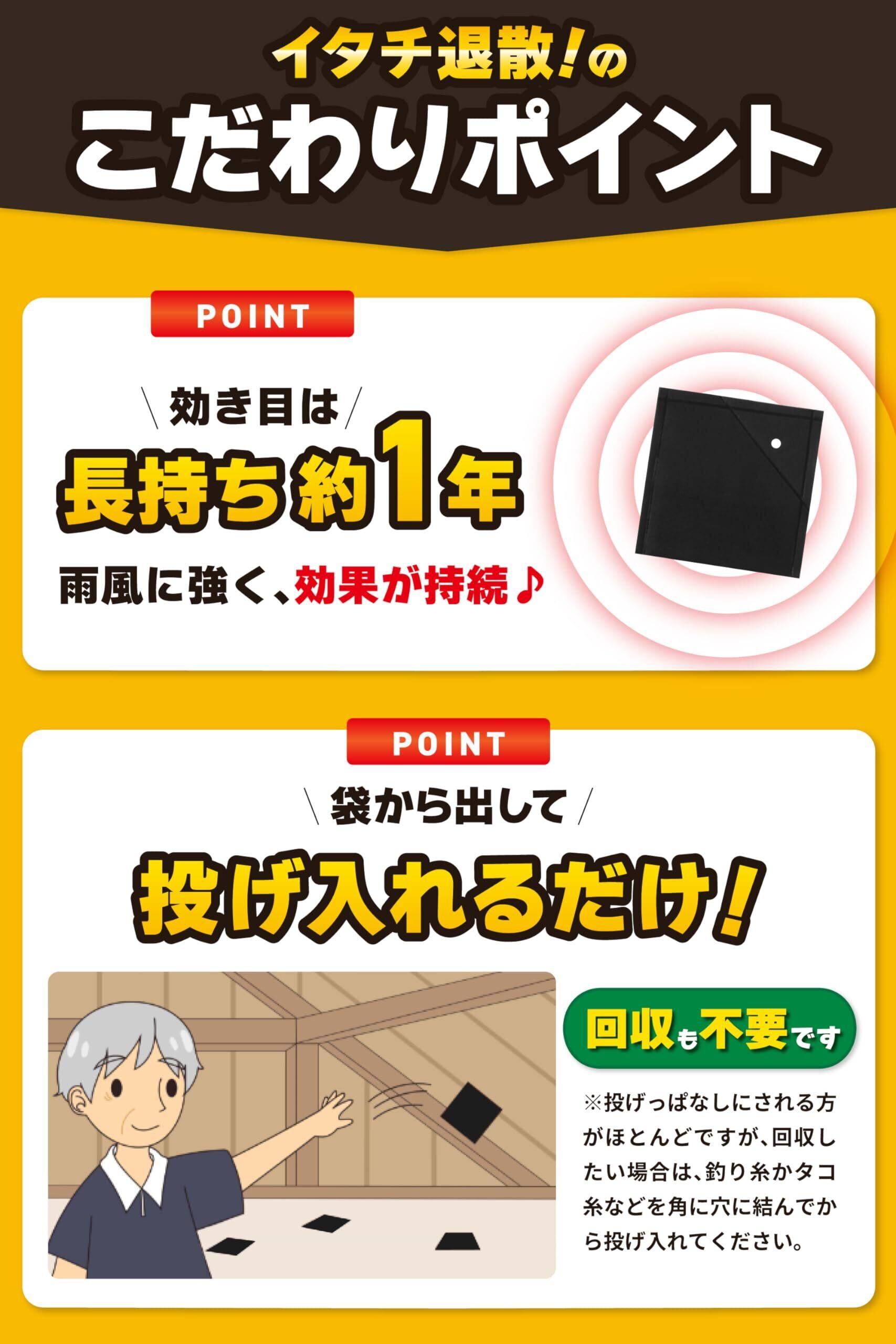 【害獣駆除のプロ推薦・シリーズ累計88,000個突破!】本能レベルで嫌う「カプサイシンのニオイ」でイタチを撤退。優れた嗅覚を持つイタチには耐えられない強烈な刺激。イタチの習性を利用してその場所への執着を断ち切る目的で害虫獣駆除の専門業者との共同研究から開発された忌避剤です。お陰様でシリーズ累計88,000個突破!致しました。ご愛用頂き誠にありがとうございます。