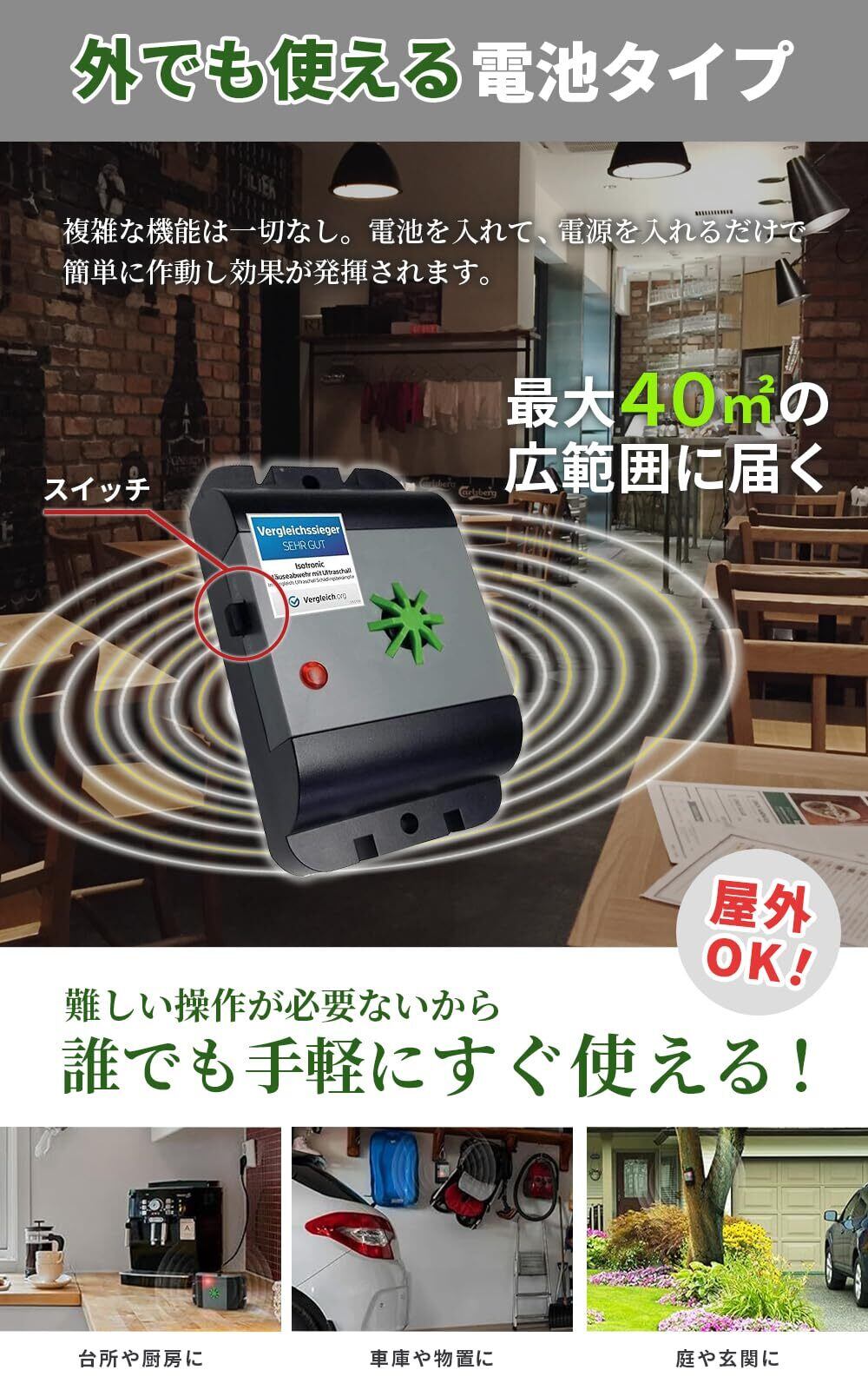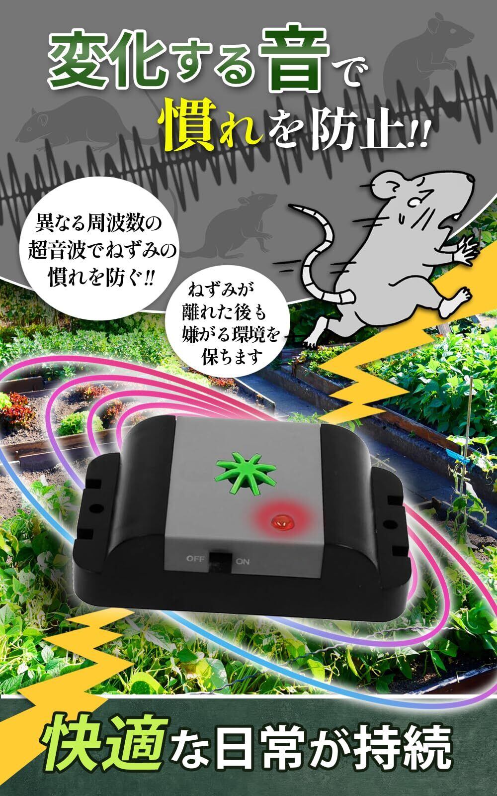 ねずみの好まない周波数の超音波でねずみ駆除。ねずみが習慣的に来るような場所においておくことで、ねずみが住みづらいと感じ、住処を変えるようになります。