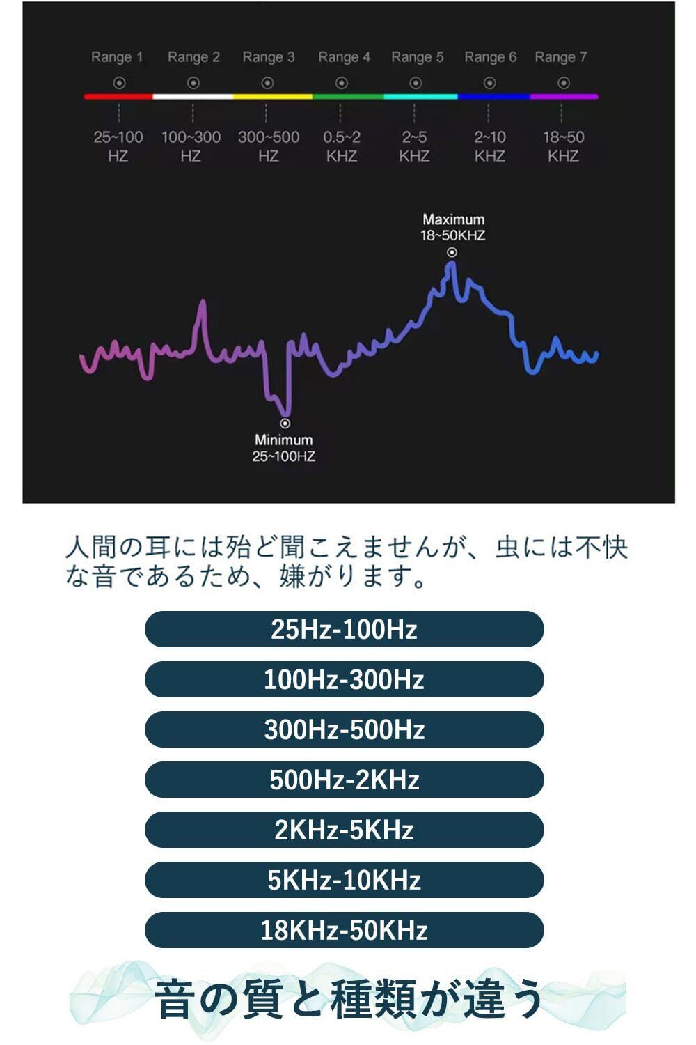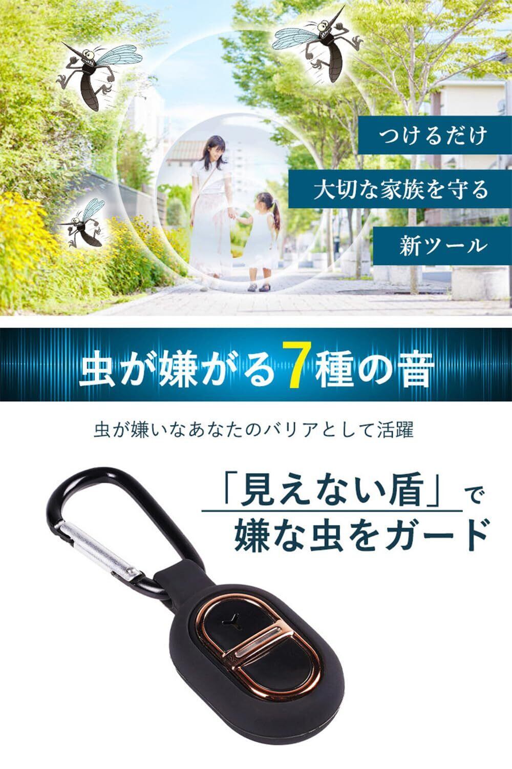 【虫が嫌がる7種の音】効果範囲は最大約30m。kindsHZを360度全方位に拡散。つけるだけで虫が嫌がり逃げていきます。薬剤不使用で安全、無臭で快適、より効果的。大切な家族、お子様やペットを守る新しい虫よけツール。見えない「音の盾」で虫をガード。