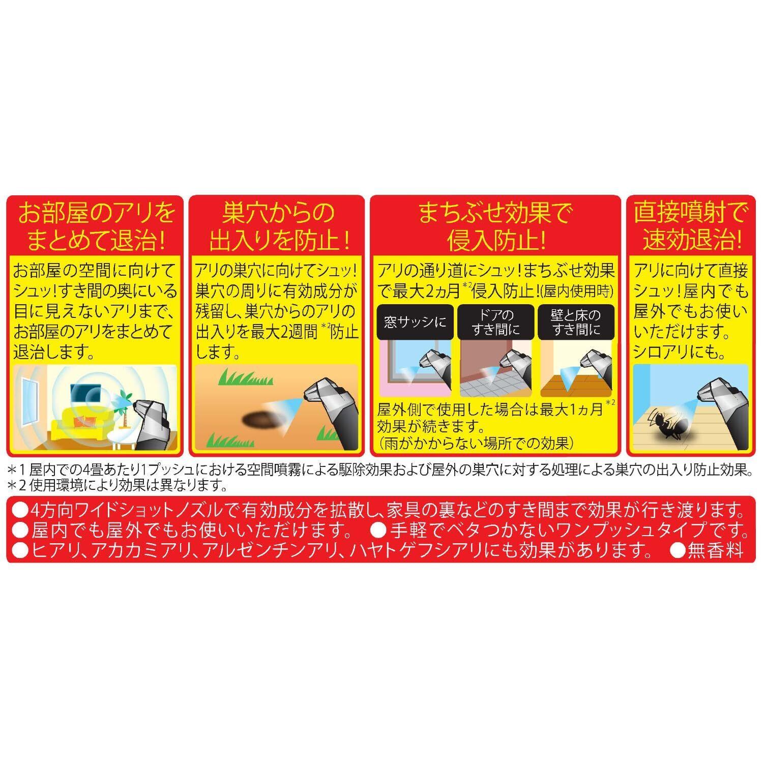 ●手に持って、前方に向かってボタンを1回押すと必要量が噴射します。駆除後は換気してください。<空間噴霧(屋内)によるまとめて退治効果>※噴射時は窓やドアを閉める。部屋の中央の空間に向かって噴射する。4畳に1回噴射する。※部屋の広さに応じて適宜回数を増やす。<巣穴の出入り防止効果>●アリの巣穴に向かって約30cmの距離から1回噴射する。※噴射直後はアリが薬剤を感じて巣穴から出てくることがあります。<侵入防止、まちぶせ効果>●アリの侵入してきそうな場所(窓サッシやドアのすき間等)に約50cmの距離から1回噴射する。<直接駆除効果>●アリに向かって約30cmの距離から直接噴射する。