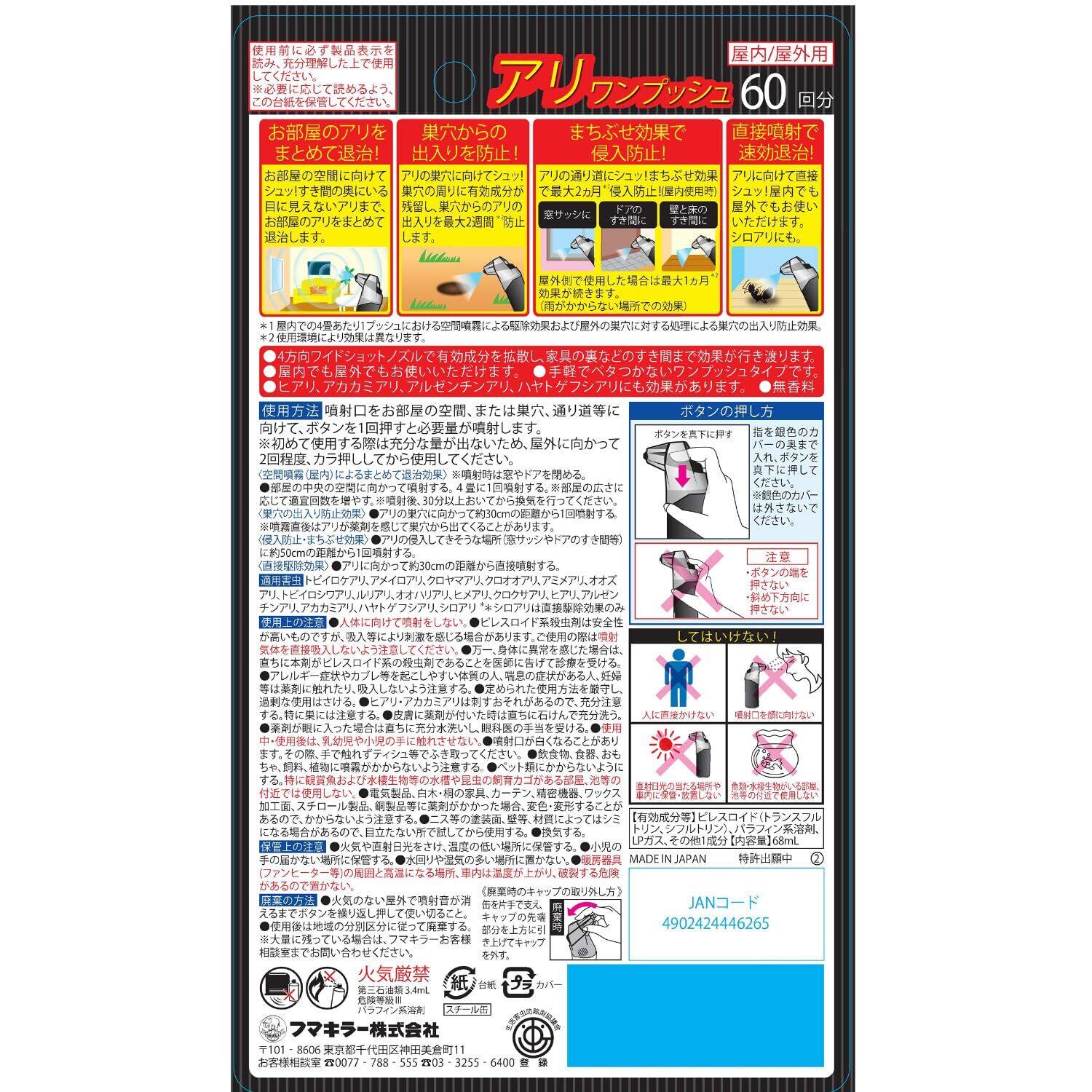 <使用上の注意>●人体に向けて噴射をしない。●ピレスロイド系殺虫剤は安全性が高いものですが、吸入等により刺激を感じる場合があります。ご使用の際は噴射気体を直接吸入しないよう注意してください。●万一、身体に異常を感じた場合は、直ちに本剤がピレスロイド系の殺虫剤であることを医師に告げて診療を受ける。●アレルギー症状やカブレ等を起こしやすい体質の人、喘息の症状がある人、妊婦等は薬剤に触れたり、吸入しないよう注意する。●定められた使用方法を厳守し、過剰な使用はさける。●ヒアリ、アカカミアリは刺すおそれがあるので、充分注意する。特に巣には注意する。●皮膚に薬剤が付いた時は直ちに石けんで充分洗う。●薬剤が眼に入った場合は直ちに充分水洗いし、眼科医の手当を受ける。●使用中、使用後は、乳幼児や小児の手に触れさせない。●噴射口が白くなることがあります。その際、手で触れずティシュ等でふき取ってください。●飲食物、食器、おもちゃ、飼料、植物に噴霧がかからないよう注意する。●ペット類にかからないようにする。特に観賞魚および水棲生物等の水槽や昆虫の飼育カゴがある部屋、池等の付近では使用しない。●電気製品、白木、桐の家具、カーテン、精密機器、ワックス加工面、スチロール製品、銅製品等に薬剤がかかった場合、変色、変形することがあるので、かからないよう注意する。●ニス等の塗装面、壁等、材質によってはシミになる場合があるので、目立たない所で試してから使用する。●換気する。<保管上の注意>●火気や直射日光をさけ、温度の低い場所に保管する。●小児の手の届かない場所に保管する。●水回りや湿気の多い場所に置かない。●暖房器具(ファンヒーター等)の周囲と高温になる場所、車内は温度が上がり、破裂する危険があるので置かない。<廃棄上の注意>●火気のない屋外で噴射音が消えるまでボタンをくり返し押して使い切ること。●使用後は地域の分別区分に従って廃棄する。※大量に残っている場合は、フマキラーお客様相談室までお問い合わせください。