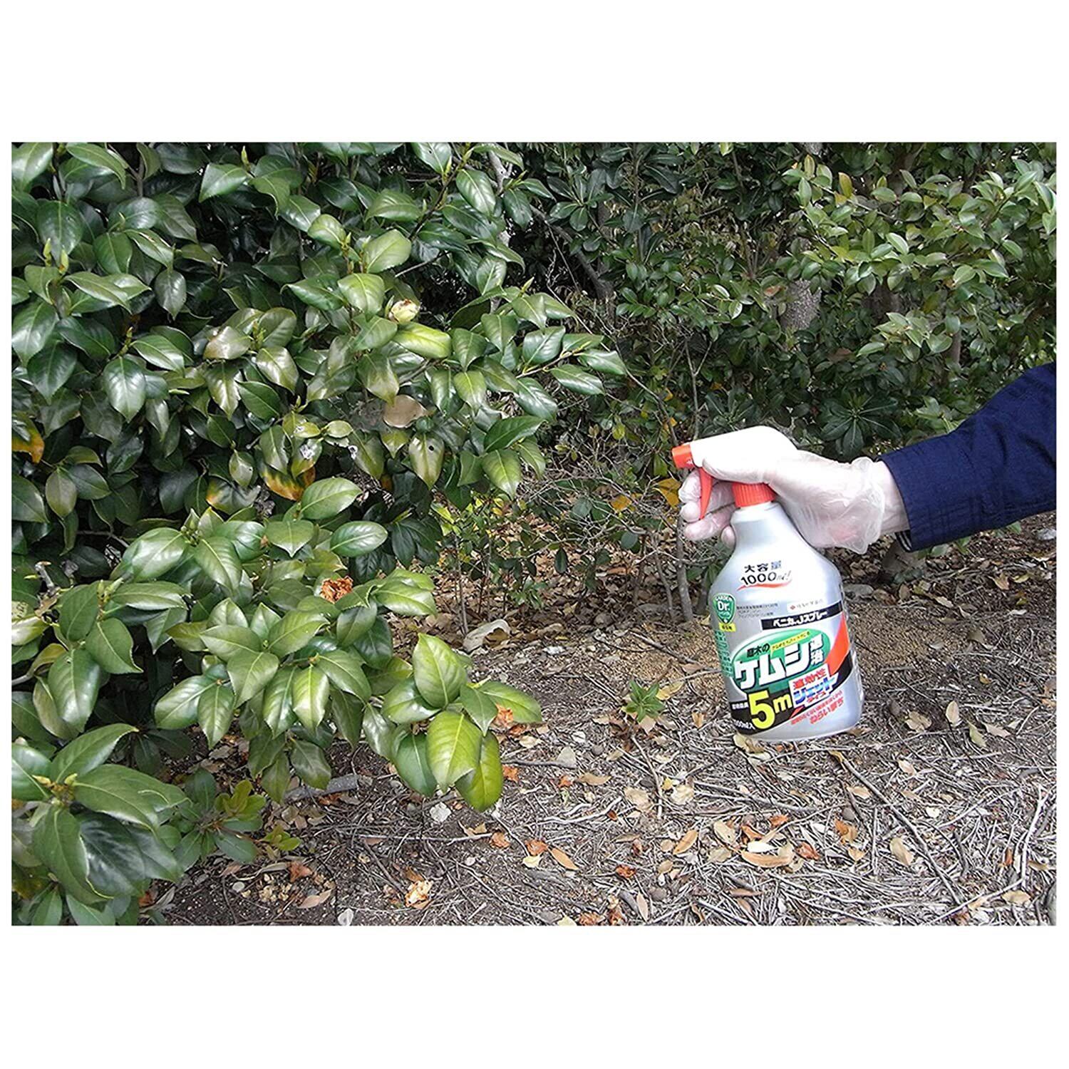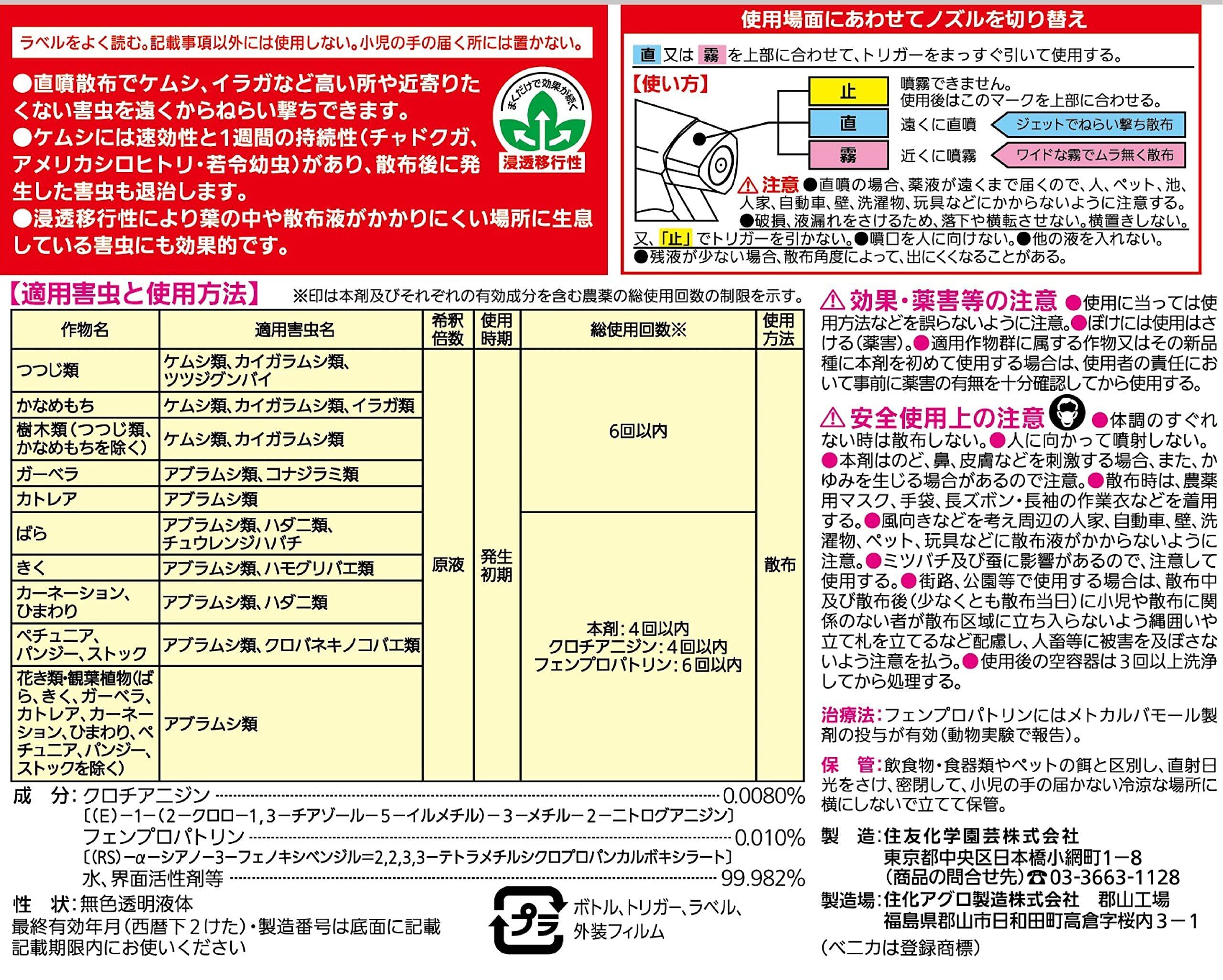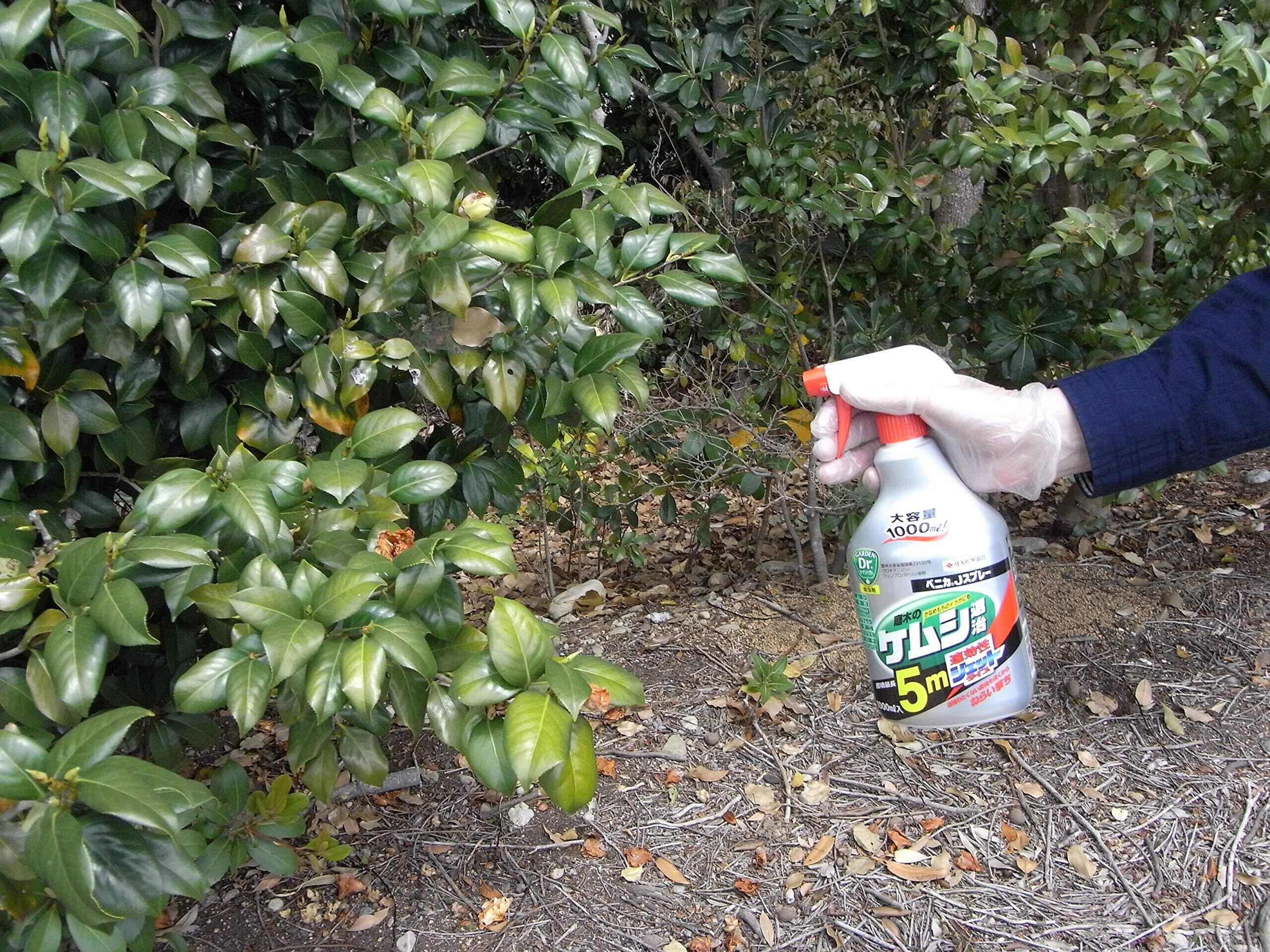 特徴:直噴散布でケムシ、イラガなど高い所や近寄りたくない害虫を遠くからねらい撃ちできます。速効性と持続性があり、散布後に発生した害虫も退治します。