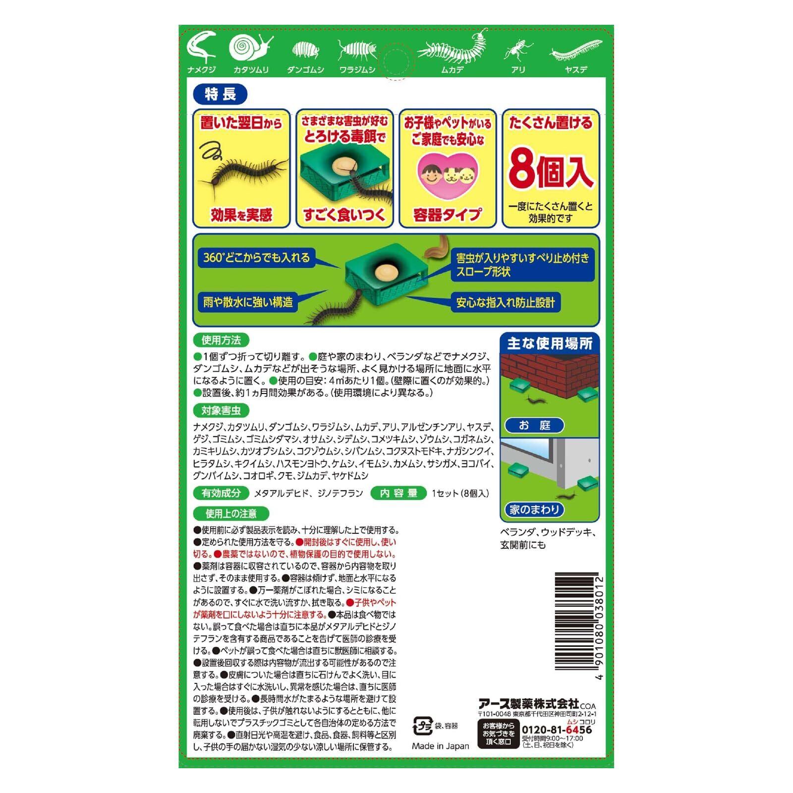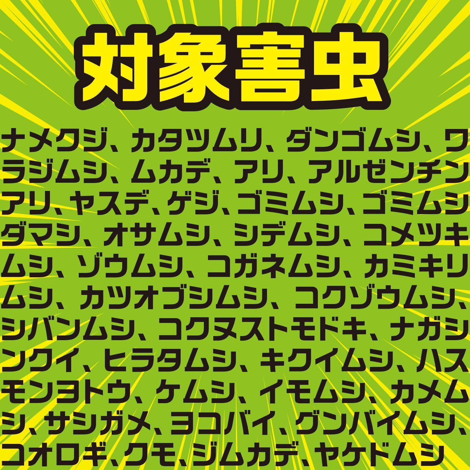【対象害虫】ナメクジ、カタツムリ、ダンゴムシ、ワラジムシ、ムカデ、アリ、アルゼンチンアリ、ヤスデ、ゲジ、ゴミムシ、ゴミムシダマシ、オサムシ、シデムシ、コメツキムシ、ゾウムシ、コガネムシ、カミキリムシ、カツオブシムシ、コクゾウムシ、シバンムシ、コクヌストモドキ、ナガシンクイ、ヒラタムシ、キクイムシ、ハスモンヨトウ、ケムシ、イモムシ、カメムシ、サシガメ、ヨコバイ、グンバイムシ、コオロギ、クモ、ジムカデ、ヤケドムシ