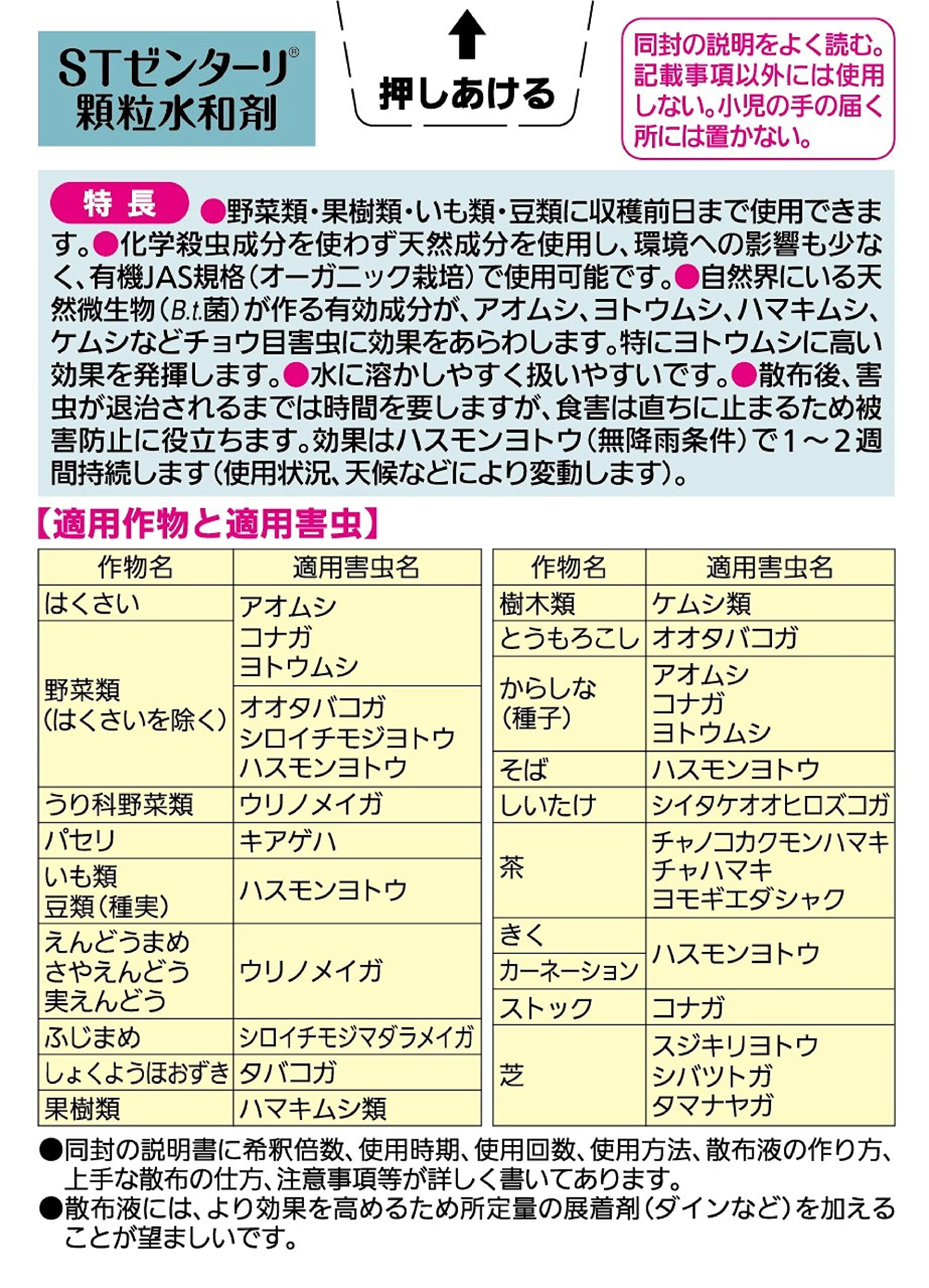 ・特に従来のBT剤で効果が低かったヨトウムシや、他の殺虫剤に抵抗性のついたコナガに高い効果を発揮し、顆粒水和剤のため、粉立ちがなく水に溶けやすく扱いやすい