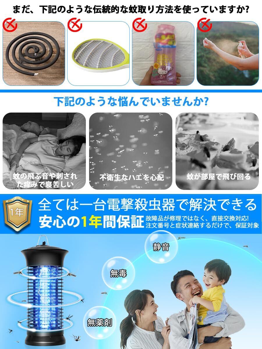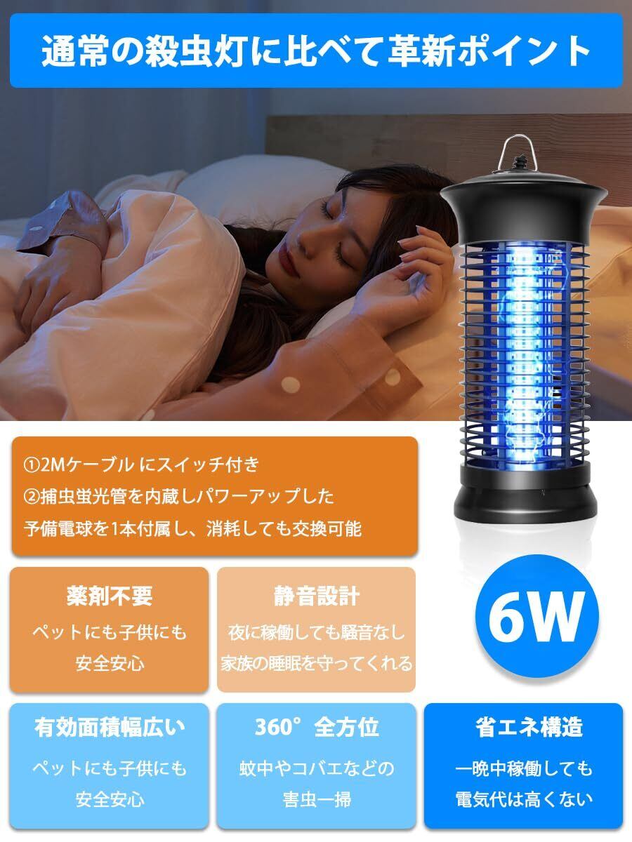 【2025最新進化した超強い電撃殺虫器、強力蚊除け、オリジナルの予備電球付き】改善点①:コードの長さを2メートルに延長。改善点②:コードにもスイッチボタンを設置しており、電源を抜かなくても電源オフが可能。より幅広い場合にご利用いただけるようになりました。6Wの補虫蛍光管を内蔵してパワーアップ、従来品より有効範囲が広がりまして、360°全方位スキャナーしたりして蚊などを誘惑します。その上に、予備電球としてオリジナルの電球をもう1本追加して、切り替えが簡単で使用寿命を倍伸ばすことができ、コスパが超高い殺虫灯LEDライトです。害虫が好む光に集まる習性を利用して、紫外線ライトで誘導して、害虫が内側の高圧電撃ネットを触れると瞬時に感電死させます。パシッとなどの騒ぎがなしに、火もなしに、内部には密集な静電ネット式な設計なので、虫などを逃げられないです。昼夜を問わずいつでも連続して静音で動作することができます。(殺虫効果向上のため、本電撃殺虫器を一定時間をご利用後ブラシ虫の死骸やホコリを清掃してください。)