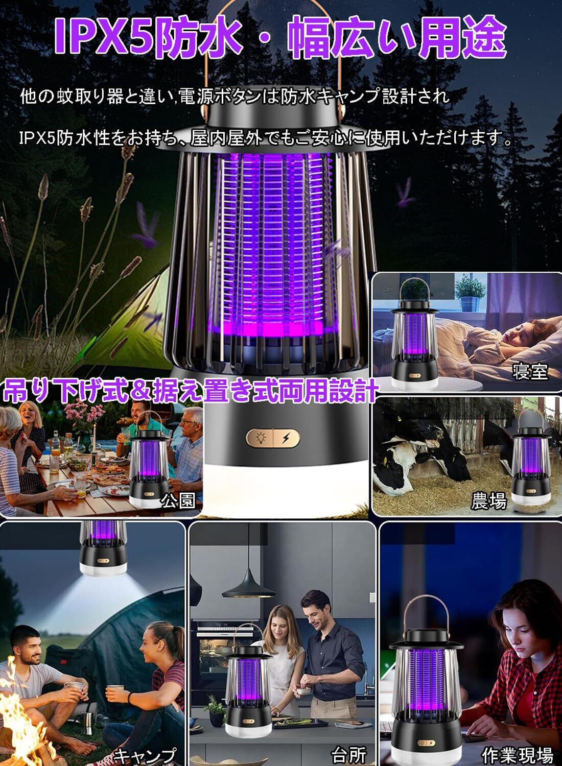 【3つの調整モード・LED照明ランプ ・幅広い用途】蚊取りモード:右側のボタンを長押しすることで、蚊取りモードを起動します。このモードでは紫色のライトが点灯し、電気ショックにより蚊を効率的に駆除します。 炎ムードモード:右側のボタンをダブルクリックすることで、炎ムードライトが点灯します。照明モード:左側のボタンを長押しすると底部の照明ライトが点灯します。再度ボタンを押すことで明るさを調整可能です。蚊を退治するだけでなく照明もできる、雰囲気作りや間接照明に適しており、キャンプ、釣り、寝室、オフィスなどでの使用におすすめです。吊り下げ式&据え置き式両用設計、庭に吊り下げも可能、室内据え置きもでき、便利にご使用いただけます、操作が簡単で。パッケージ内容:電撃殺虫器本体*1、掃除ブラシ*1、充電ケーブル*1、取扱説明書*1。屋内利用:この電撃殺蚊灯はキッチン、玄関、リビングルーム、子供部屋、飲食店、寝室、養鶏場、養豚場、オフィスなど様々な場所でお使いいただけます。屋外利用:庭、作業現場、海辺、公園、キャンプ、登山、釣り、ハウス栽培場など。