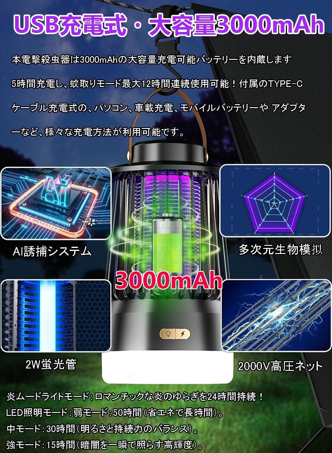 【USB充電式・大容量3000mAh】この電撃殺虫器は直接コンセントで使用できるだけでなく。コンセントがなくて も、捕虫器 はモバイルバッテリーで充電対応可能で。付属のTYPE-Cケーブル充電式の、パソコン、車載充電、モバイルバッテリーや アダプターなど、様々な充電方法が利用可能です。コードレスでも長時間使用できる虫除けライトなので、室内だけではなく、キャンプや夜釣りなどアウトドア用にもピッタリ。なによりも安全性を重要視しており、通常のバッテリーよりも安全で高価なリチウムポリマーバッテリーを使用しました。本電撃殺虫器は3000mAhの大容量充電可能バッテリーを内蔵します。5時間充電し、蚊取りモード最大12時間連続使用可能!炎ムードライトモード:ロマンチックな炎のゆらぎを24時間持続!LED照明モード:弱モード:50時間(省エネで長時間)。中モード:30時間(明るさと持続力のバランス)。強モード:15時間(暗闇を一瞬で照らす高輝度)。