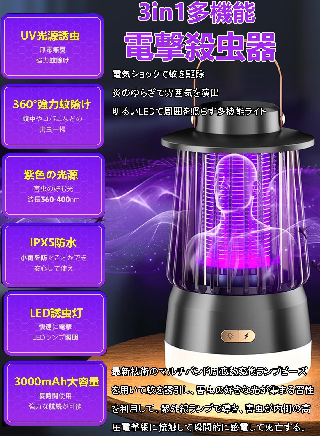 Chayoo 電撃殺虫器【2025年夏新モデル】電気蚊取り器 電撃殺虫灯 捕虫器 殺虫灯/炎ムードライト/LED照明3in1 360°強力蚊除け 誘蛾灯 コバエ取り 蚊取り器 3000mAh大容量 USB充電式 静音 省エネ経済 薬剤不用 無毒無害 IPX5防水 吊り下げ式&据え置き式両用 屋外/屋内/キャンプ/停電などに適用 日本語説明書付き(ブラック)