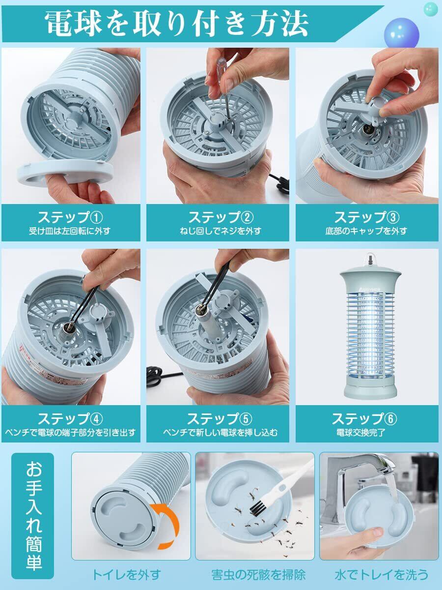 【パッケージト内容・ご注意】パッケージには電撃殺虫器本体×1、S型フック ×1、日本語説明書、掃除ブラシ×1、予 備電球×1、ねじ回し×1が含まれています。ご注意:1.ライトの最適作業時間は3000時間以内となっております。 3000時間過ぎる場合はライトをしてください。 方法につきましては、画像までご確認ください。2.本製品は 屋内専用です。屋外に設置したり、屋外で使用したままにしないでください。故障の原因となります。本品は防水仕様で はありませんので、雨や水滴のかかる場所、多湿の場所では使用しないでください