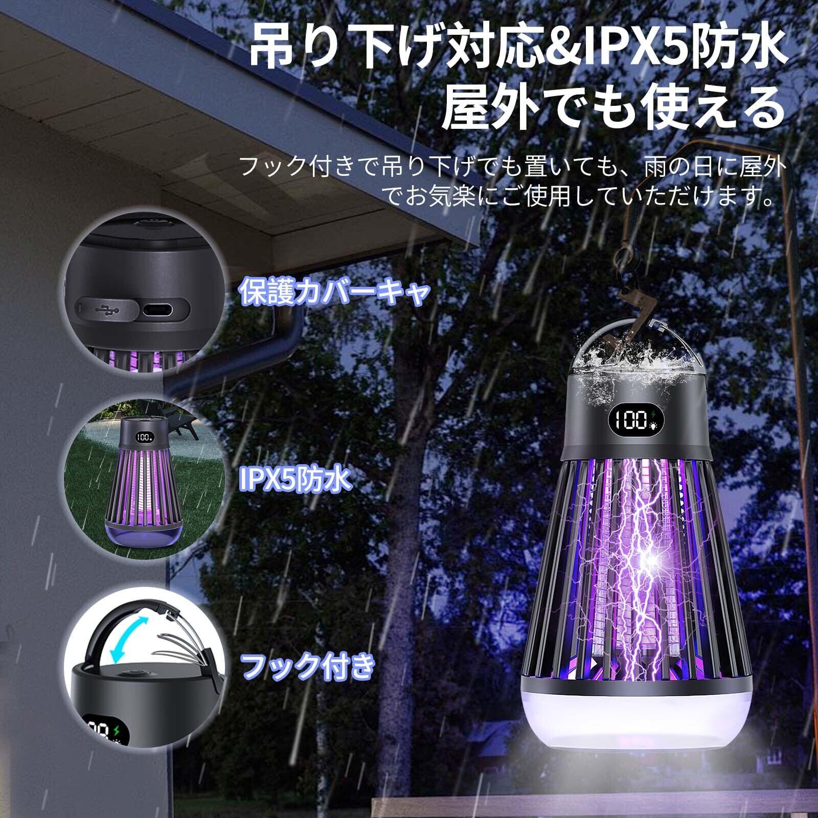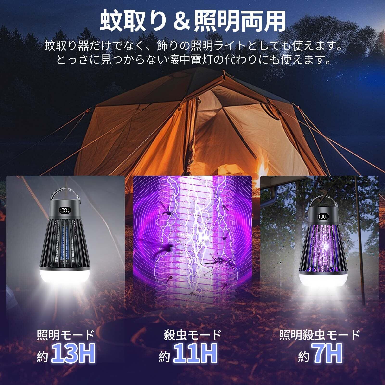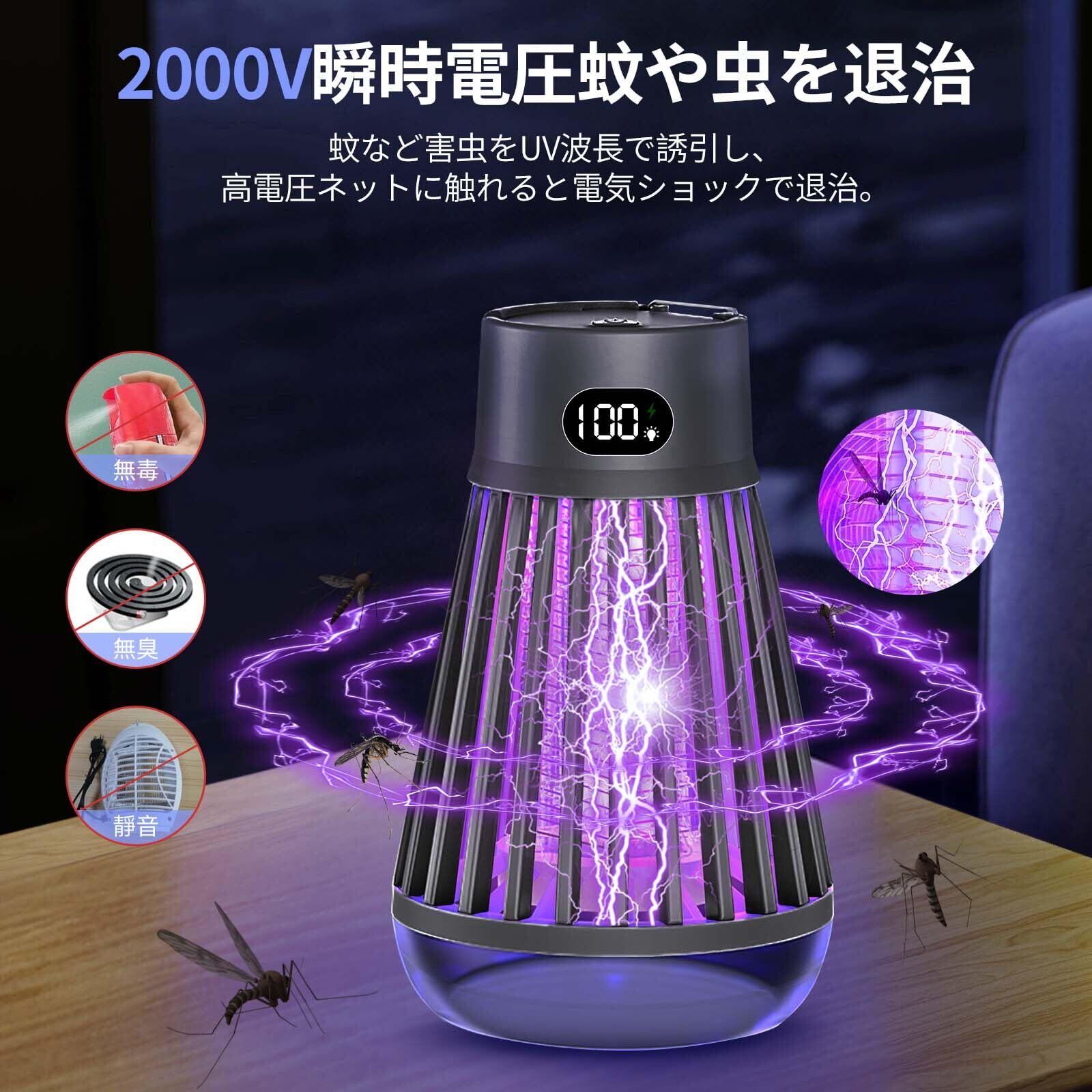【スイッチ付き・3モード切替可能】】 便利なスイッチで、操作が簡単!待機状態の場合、電源ボタンを押して使用できます!電撃殺虫器は3つのモードが調節できます。単独の照明モード、蚊取りモード、そして照明と蚊取りを同時に行うモードがあり、シーンに応じて柔軟に使えます。2000mAhの大容量バッテリーを内蔵し、長い時間程度使用可能(ご注意:1、寝室で蚊を退治するには2時間前に開けてください。2、コンセントがあれば、水のかからない場所で使用出来る!3.効果を高めるために暗い場所で使用してください!)