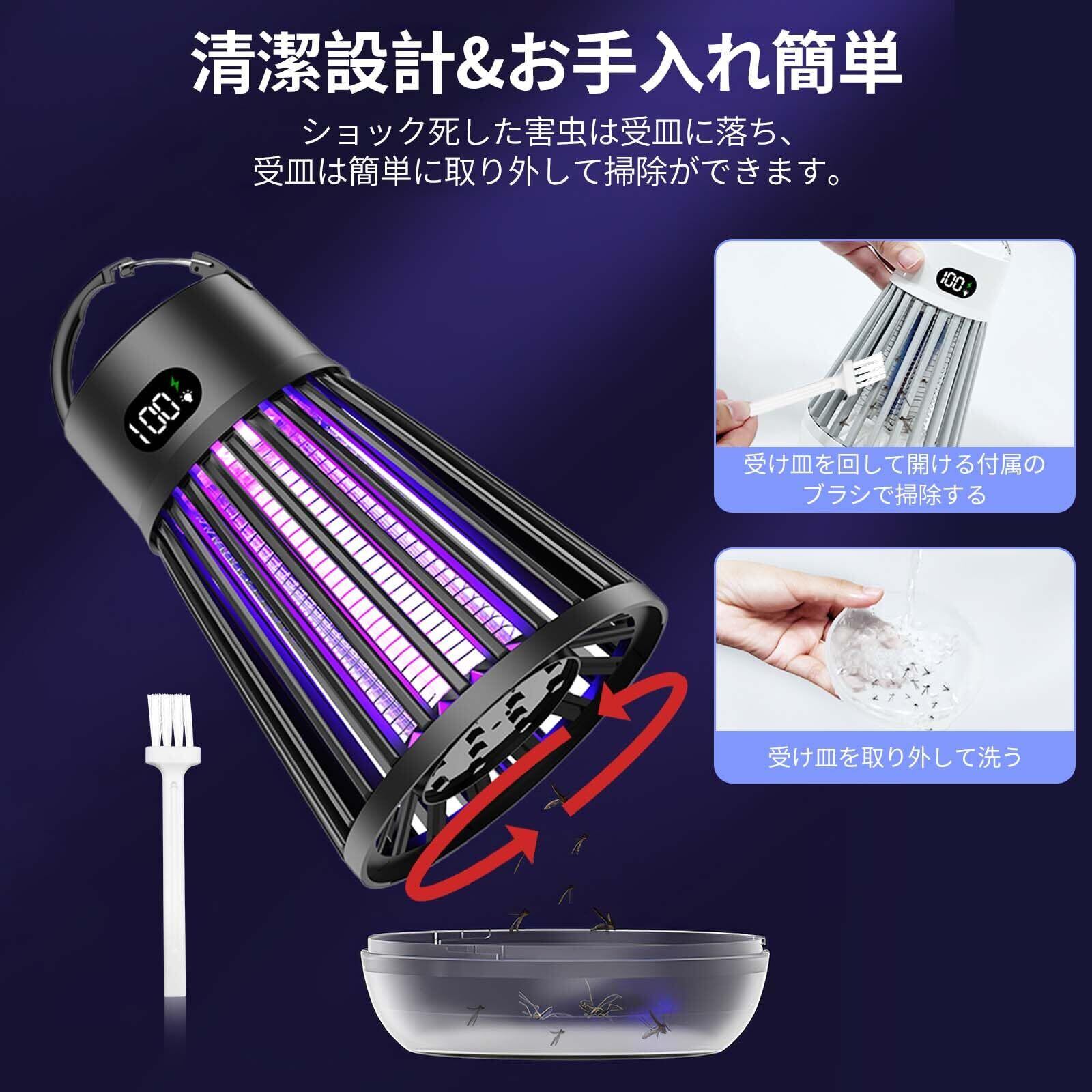 【ディスプレイ付き・可視収納ボックス】電気殺虫器のスマートディスプレイでバッテリー残量と現在のモードをリアルタイム表示、残量が一目瞭然ですぐに充電できます。本体の底に受け皿があるので、駆除された害虫は収納され、掃除用ブラシを使って、簡単に手を汚されず掃除できます。(1、清潔にする前に電源プラグがコンセントから抜けていることを確認してください。2、電気蚊取り装置の運転中に掃除をしないでください。3、殺虫効果向上のため、本製品を一定時間をご利用後ブラシ虫の死骸やホコリを清掃してください。)パッケージ内容:電撃殺虫器本体*1、掃除ブラシ*1、2M充電ケーブル*1、日本語取扱説明書*1