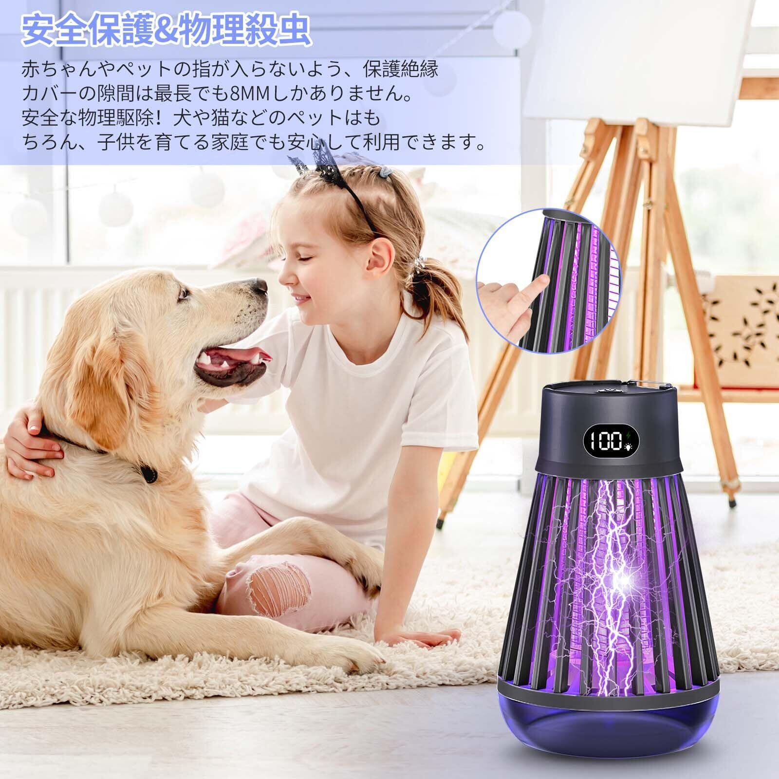 【吊り下げ・据え置き両用、屋内・屋外適用】手のひらに置けるほどのコンパクトサイズで、重さわずか超軽量タイプなので、吊り下げたり、テーブルの上に物を置く、場所を取らずどこでも使える電気蚊取り器です。り下げ式&据え置き式両用設計で殺虫機本体の上部にリングが付き、庭に吊り下げも可能、室内据え置きもでき、便利にご使用いただけ、操作が簡単で!この殺虫ライトは室内· 屋外、キッチン、リビングルーム、子供部屋、寝室、玄関、犬 猫小屋、オフィス、飲食店など様々な場所でお使いいただけます。