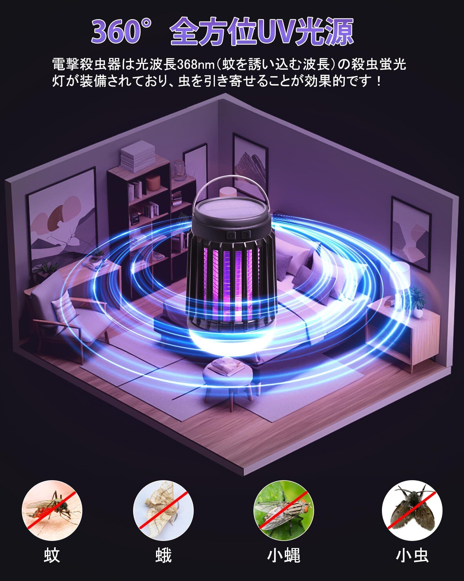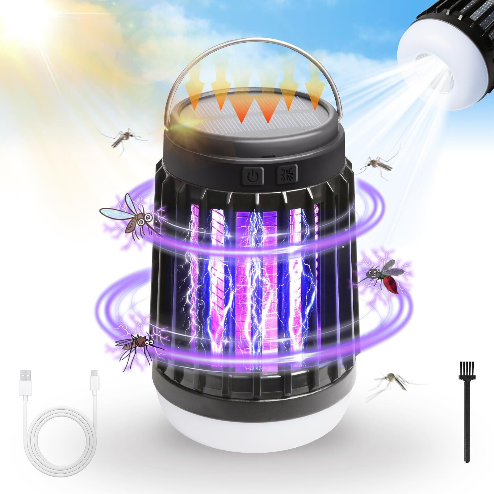 VOXIN 電撃殺虫器 ソーラー【2025年夏革新版 Type-C&ソーラー充電式】コバエ取り 蚊取り コバエ殺虫灯 捕虫器 虫除け 殺虫機 こばえ対策 誘虫灯 LED照明 UV光源吸引式 360°蚊除け 360-400nm波長 殺虫ライト 2200mAh 省エネ 薬剤不要 家庭用 静音 吊り下げ式&据え置き式両用 掃除ブラシ 日本語説明書付き