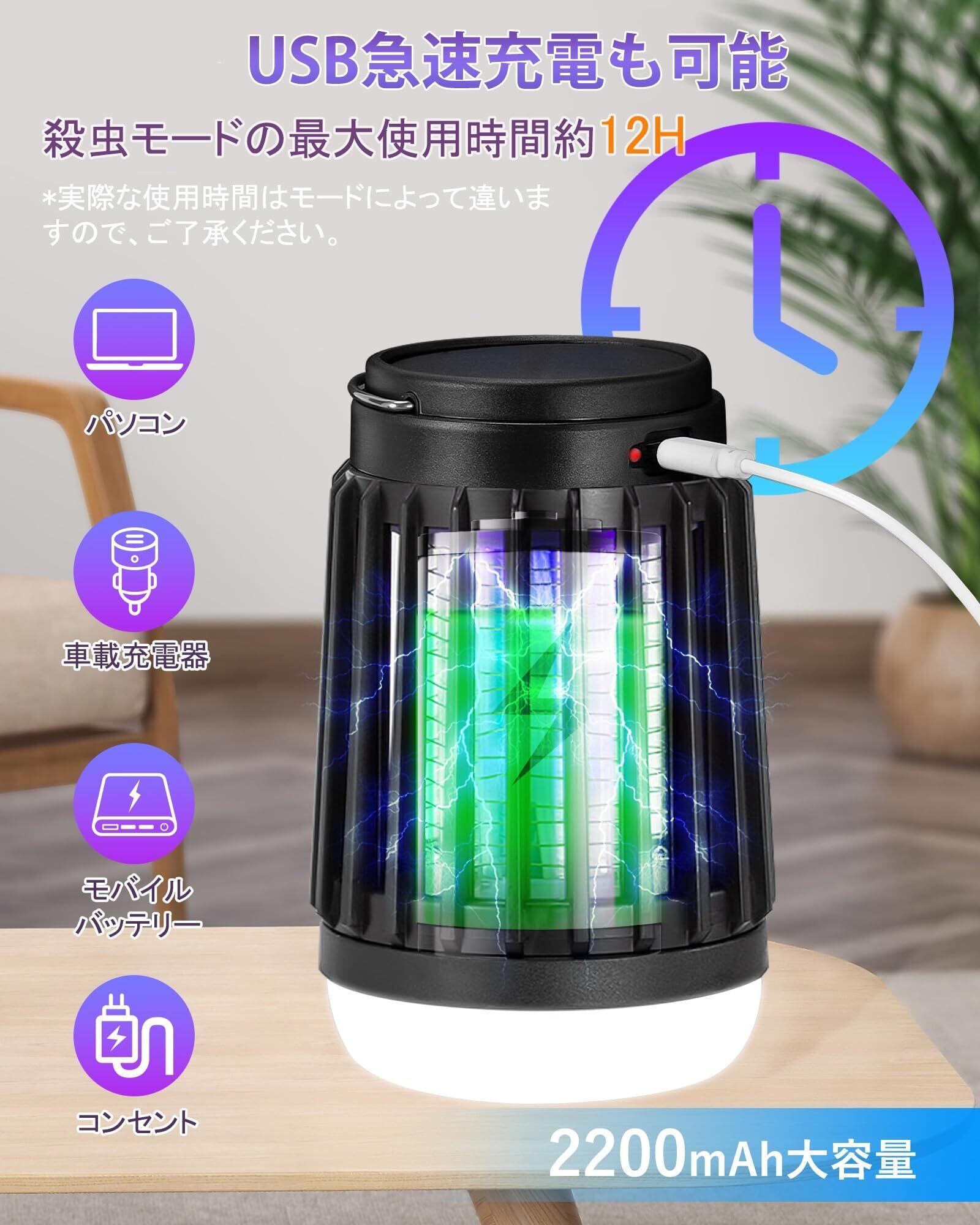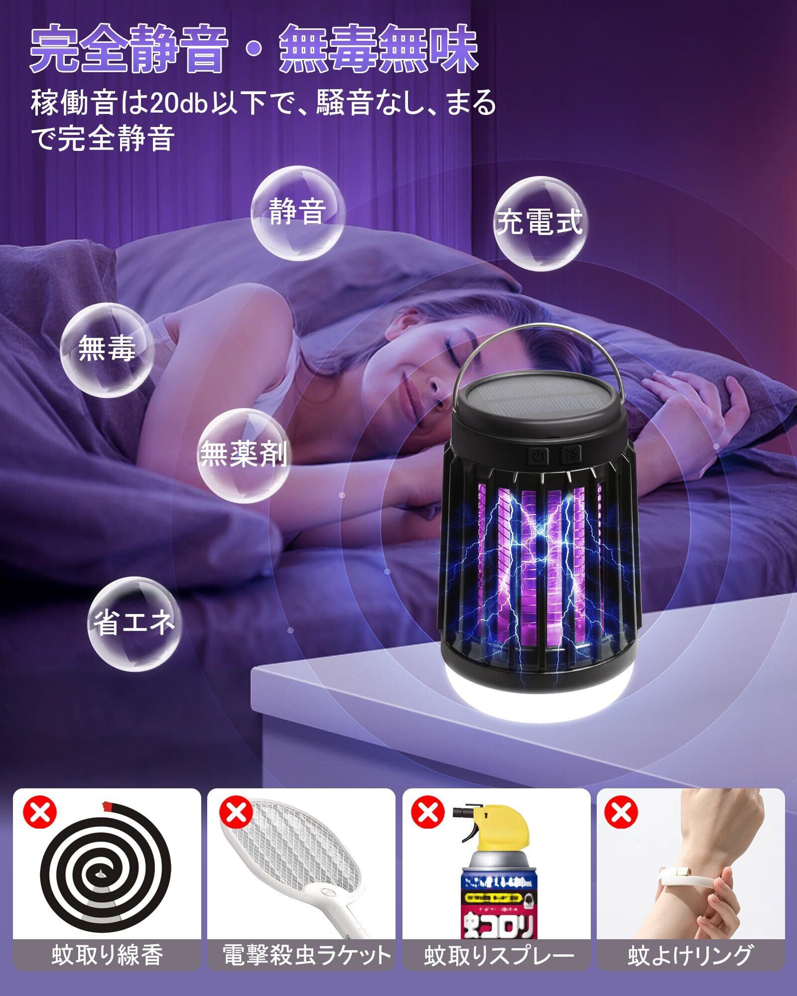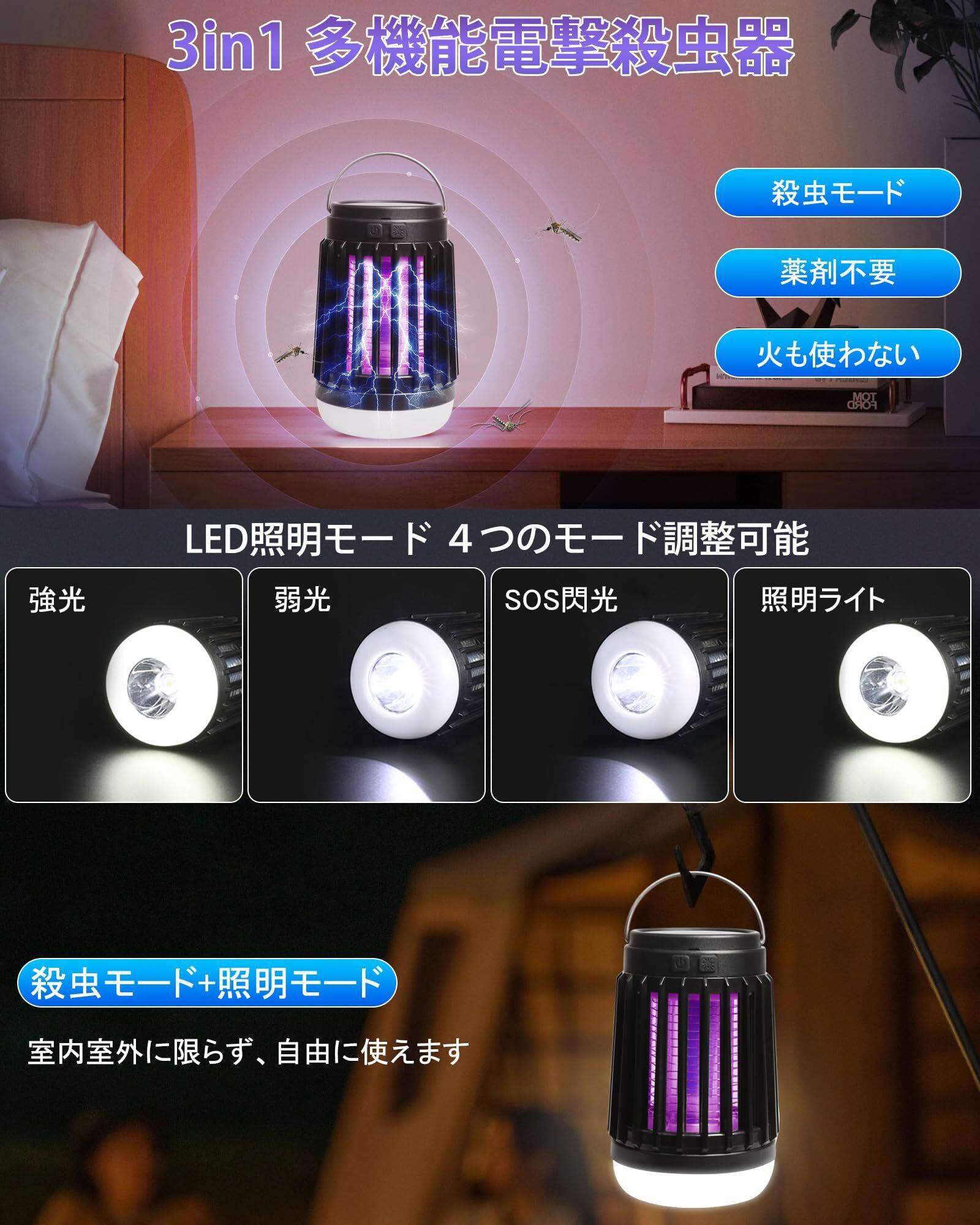 【静音設計&吊り下げ・据え置き両用】本製品の稼働音は20db以下で、騒音なし、まるで完全静音と言ってもいいです。目に優しい光なので、睡眠に邪魔ならない。手軽に持ち運べる電撃殺虫器なので、吊り下げても据え置きでも使えます。アウトドアで吊り下げも可能、室内で据え置きもでき、便利にご使用いただけます。室内での使用におすすめですが、キャンプ時のテント内でも使用可能です。(本製品や周囲で可燃性ガスを含む殺虫スプレーなどは使用しないでください。)