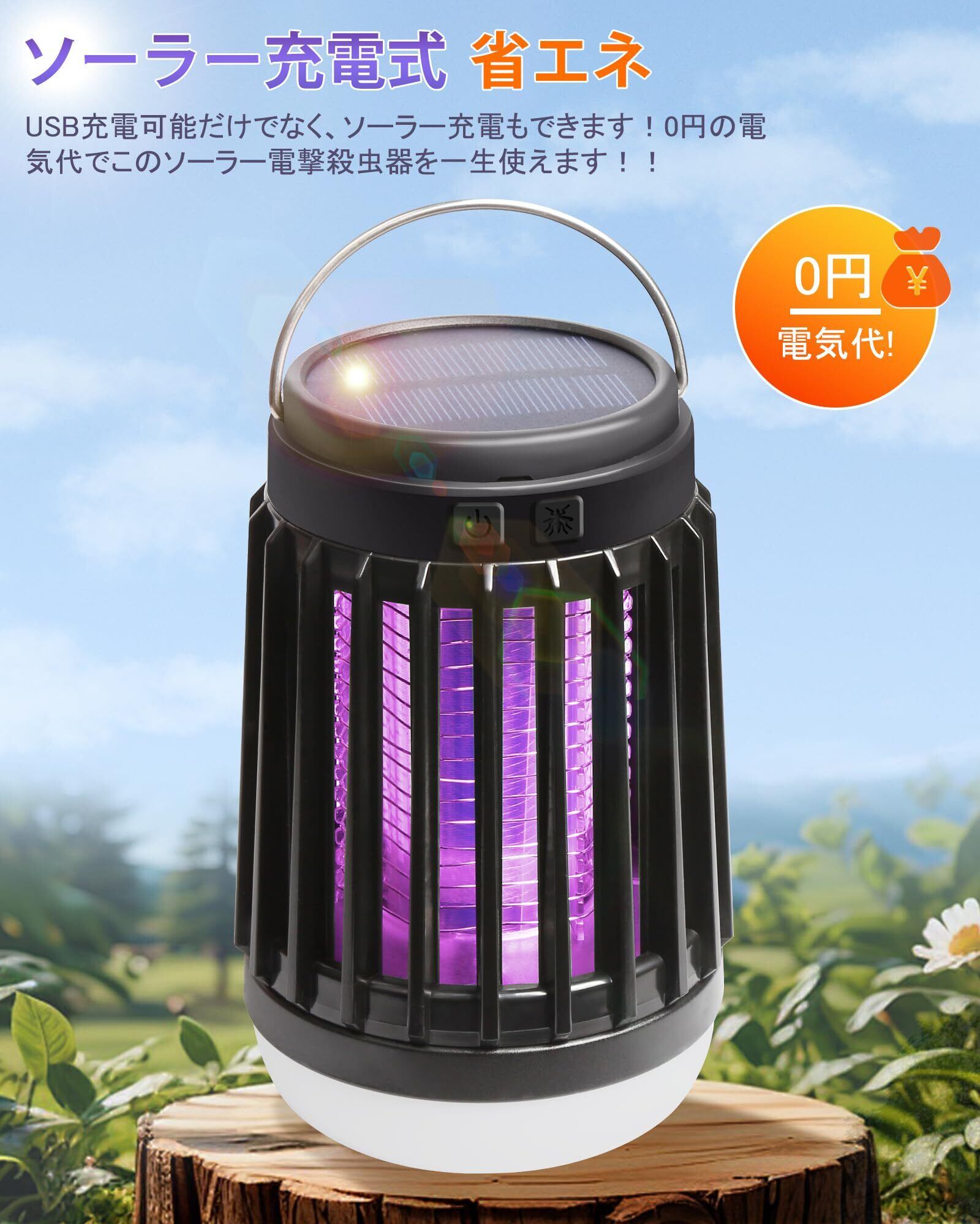 【ソーラー充電&USB充電式・省エネ】このUSB式電撃殺虫器は2200mAh大容量バッテリーを搭載され、超低消費電力最大3Wです。USB充電可能だけでなく、ソーラー充電もできます!0円の電気代でこのソーラー電撃殺虫器を一生使えます!!一回のフル充電で、殺虫モードの持続使用は約12時間です。実際な使用時間はモードによって違いますので、ご了承ください。コンセント、モバイルバッテリー、コンピューターで充電可能です。どこにでも持ち運べることが本製品のメリットです。室内だけではなく、キャンプや夜釣りなどアウトドア用にもピッタリです。また、パッケージに掃除用のブラシが付き、簡単に手を汚されず掃除できます。(殺虫効果向上のため、本電撃殺虫器を一定時間をご利用後ブラシで虫の死骸やホコリを清掃してください。)