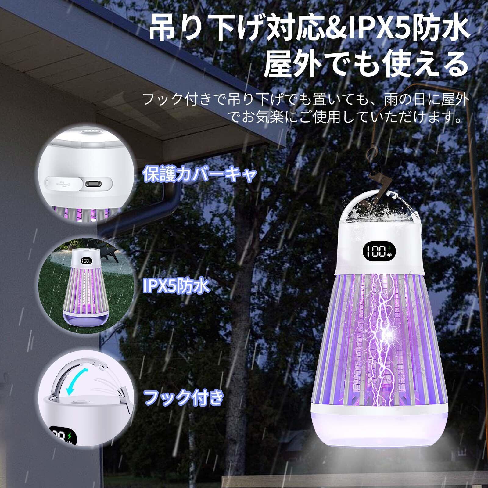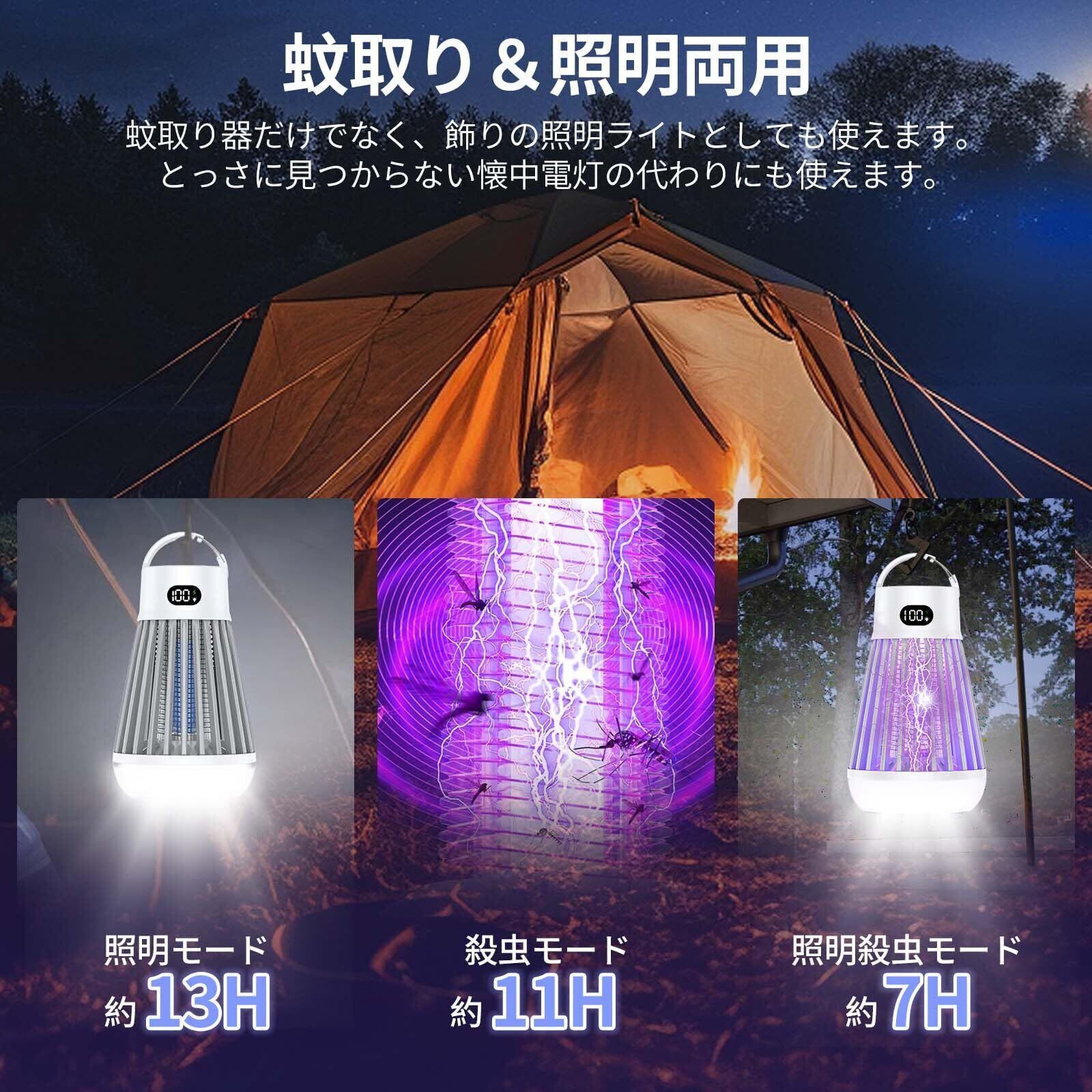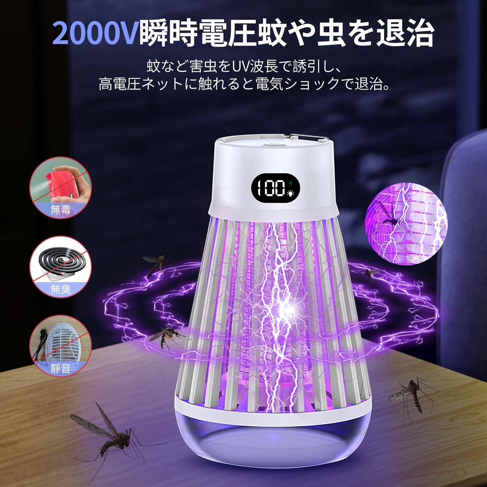 【スイッチ付き・3モード切替可能】】 便利なスイッチで、操作が簡単!待機状態の場合、電源ボタンを押して使用できます!電撃殺虫器は3つのモードが調節できます。単独の照明モード、蚊取りモード、そして照明と蚊取りを同時に行うモードがあり、シーンに応じて柔軟に使えます。2000mAhの大容量バッテリーを内蔵し、長い時間程度使用可能(ご注意:1、寝室で蚊を退治するには2時間前に開けてください。2、コンセントがあれば、水のかからない場所で使用出来る!3.効果を高めるために暗い場所で使用してください!)