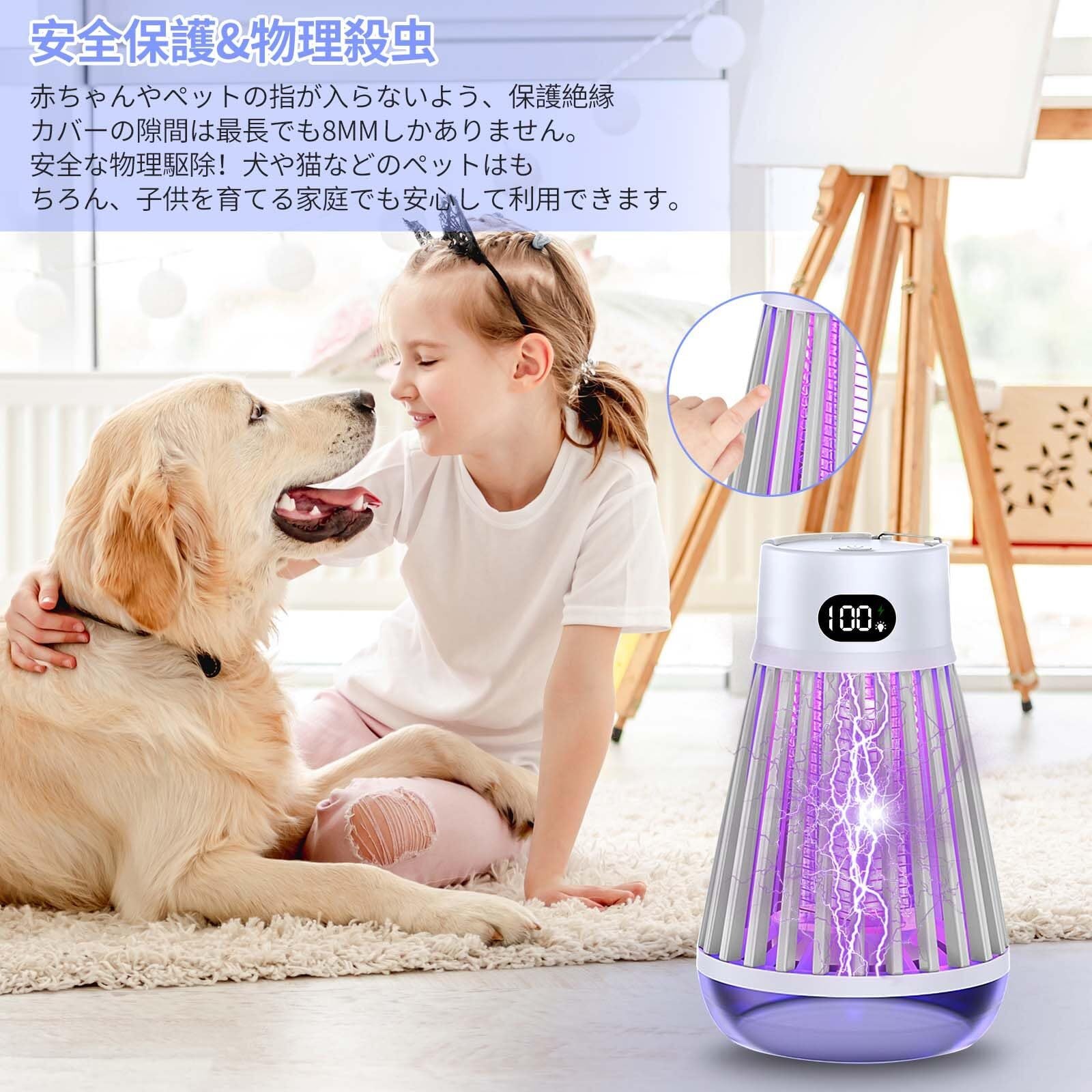 【吊り下げ・据え置き両用、屋内・屋外適用】手のひらに置けるほどのコンパクトサイズで、重さわずか超軽量タイプなので、吊り下げたり、テーブルの上に物を置く、場所を取らずどこでも使える電気蚊取り器です。り下げ式&据え置き式両用設計で殺虫機本体の上部にリングが付き、庭に吊り下げも可能、室内据え置きもでき、便利にご使用いただけ、操作が簡単で!この殺虫ライトは室内· 屋外、キッチン、リビングルーム、子供部屋、寝室、玄関、犬 猫小屋、オフィス、飲食店など様々な場所でお使いいただけます。