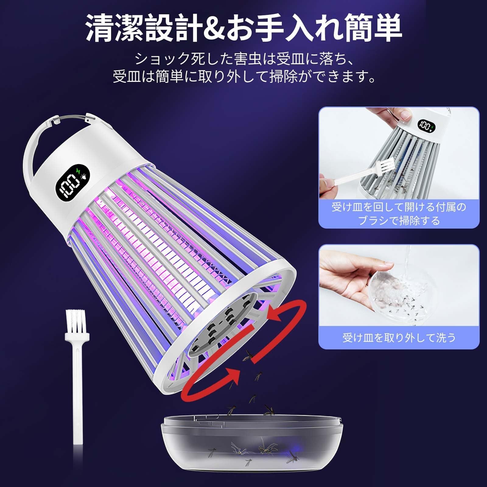 【ディスプレイ付き・可視収納ボックス】電気殺虫器のスマートディスプレイでバッテリー残量と現在のモードをリアルタイム表示、残量が一目瞭然ですぐに充電できます。本体の底に受け皿があるので、駆除された害虫は収納され、掃除用ブラシを使って、簡単に手を汚されず掃除できます。(1、清潔にする前に電源プラグがコンセントから抜けていることを確認してください。2、電気蚊取り装置の運転中に掃除をしないでください。3、殺虫効果向上のため、本製品を一定時間をご利用後ブラシ虫の死骸やホコリを清掃してください。)パッケージ内容:電撃殺虫器本体*1、掃除ブラシ*1、2M充電ケーブル*1、日本語取扱説明書*1