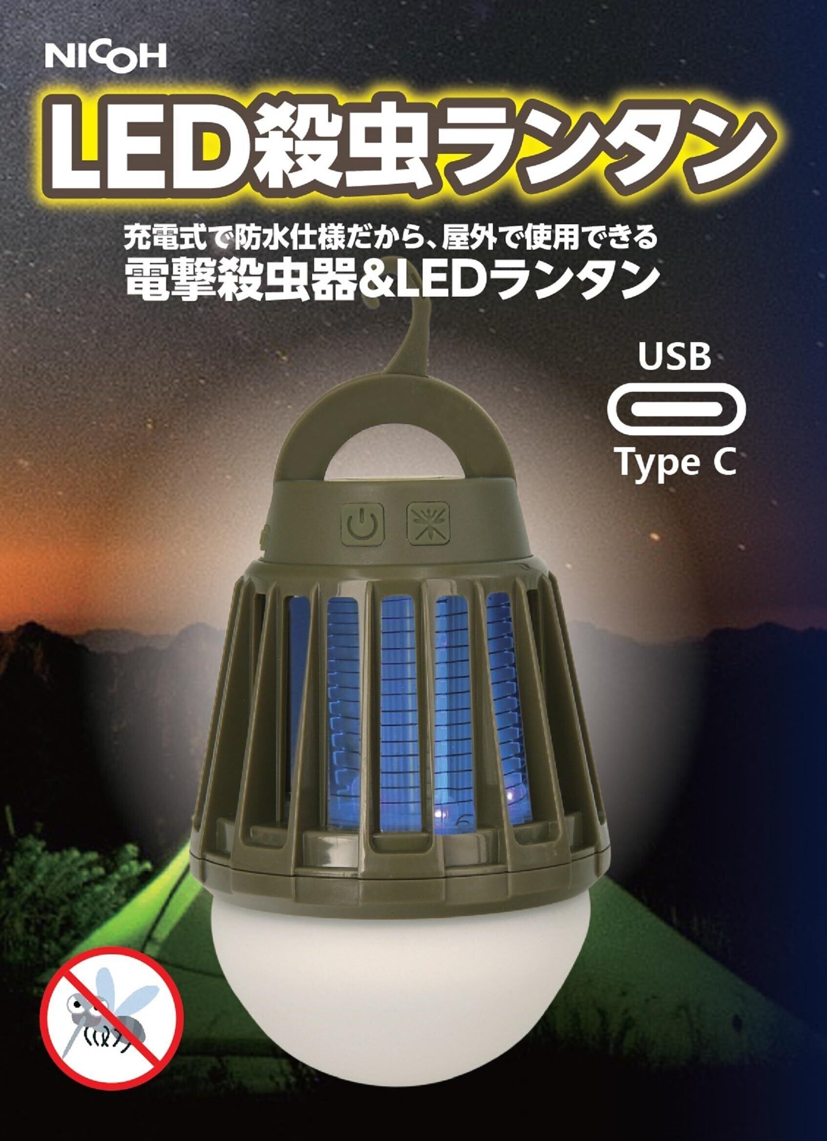ニコー(NICOH) LED殺虫ランタン/USBタイプC充電 電撃殺虫器 & 照明ランタン の1台2役! NCS-3000LN オリーブグリーン色 充電式 防水 仕様 だから 屋外 での使用が可能 アウトドア キャンプ レジャー に最適 USB C | KSショップ
