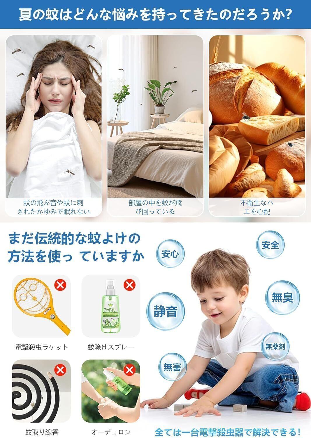 【2025年最新改良型電撃殺虫器&強力紫外線光源誘引器】360°全面蚊よけ、この電撃殺虫器は多波長周波数変換ランプビーズの最新技術を採用し、蚊を誘引し、昆虫の習性を利用して好みの光を集め、紫外線を利用して昆虫を誘導し、害虫が内部の高圧送電網に接触すると、瞬時に感電死します。 360°全方位に昆虫を吸引し、害虫の好きな光波(波長:波長360-400nm)を発射し、効果的に害虫を誘引し、瞬時に殺虫します。本機から出る紫外線は昆虫などを吸引し、妊婦や赤ちゃん、ペットがいる家でも安全です。化学薬品を使用していないため、臭いや煙も出ず、人やペットに優しい無害な殺虫剤です。 夏の必需品であることは間違いない!
