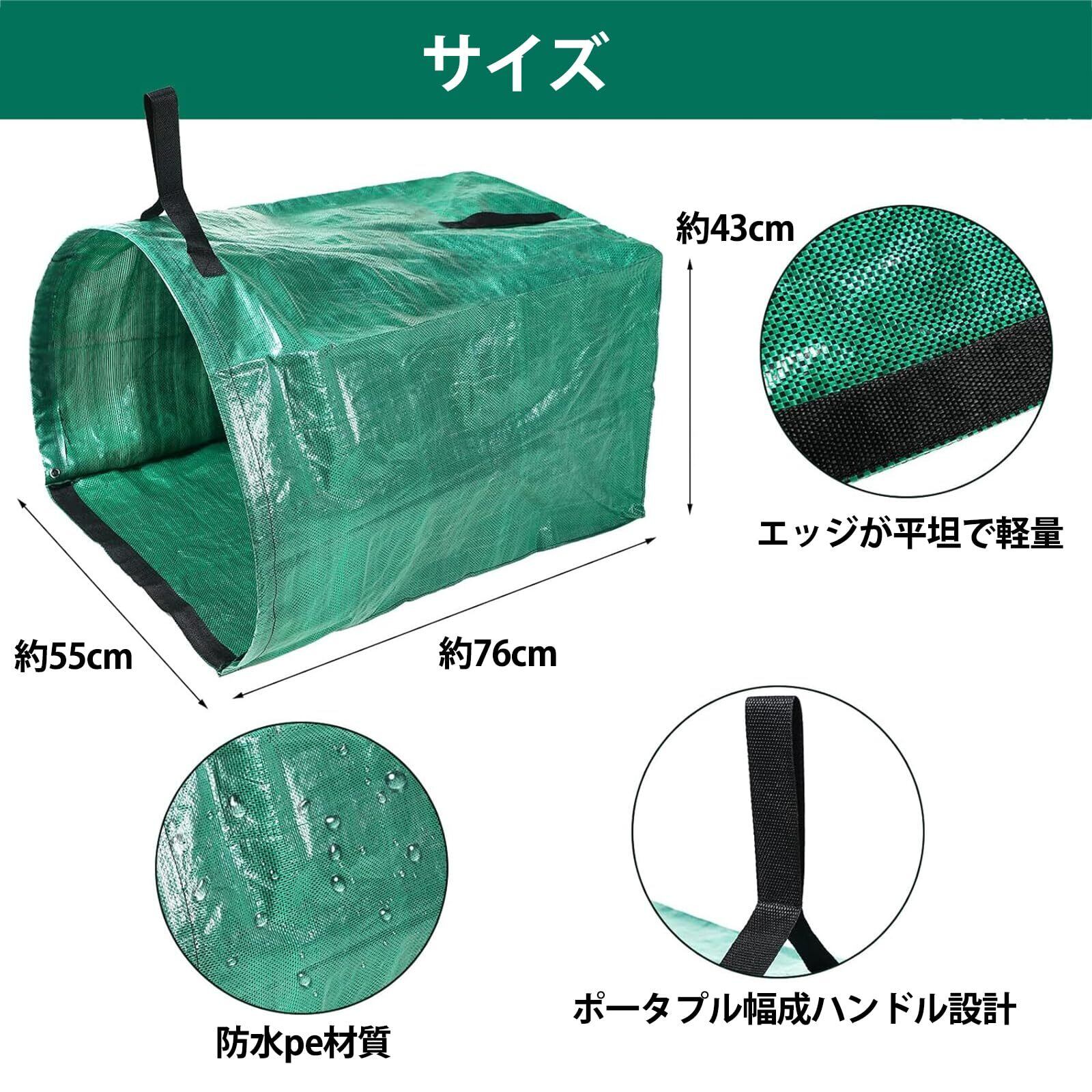 【基本情報】ちりとり&集草バッグ - 最大容量(各袋)の200L - サイズ:76cm*55cm*43cm - バッグあたり45kgの最大重量。製造国:中国 素材:ポリプロピレン 色:緑。