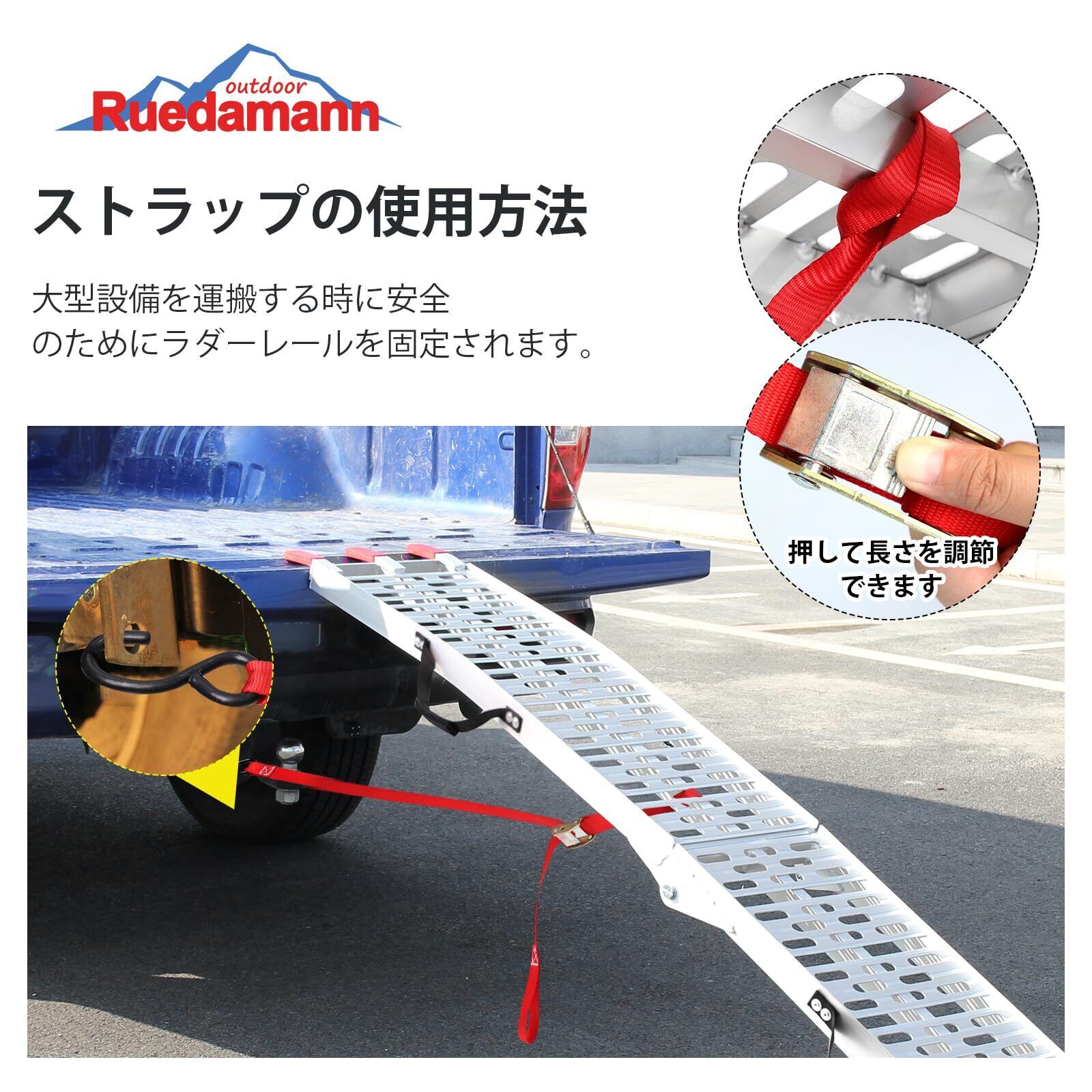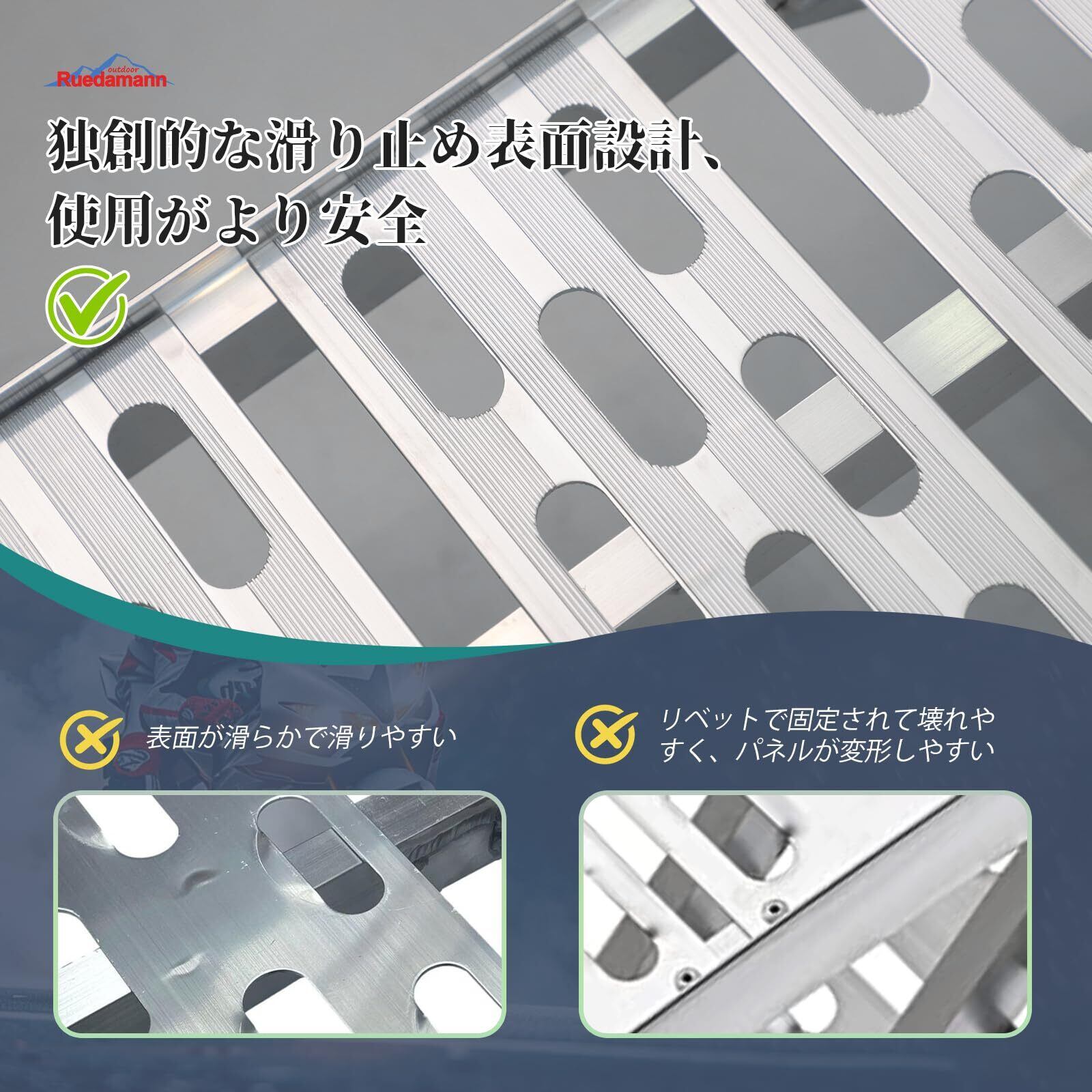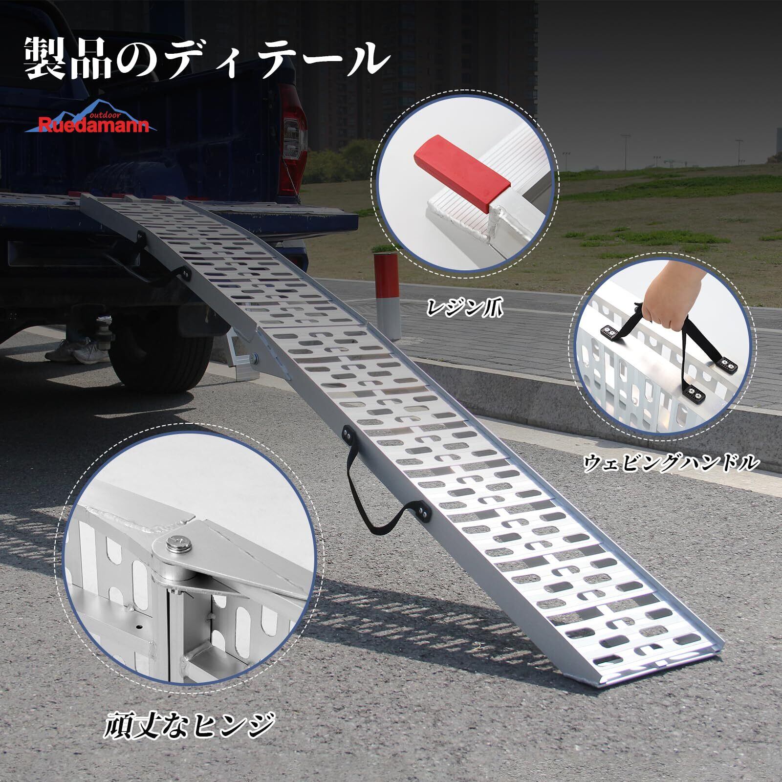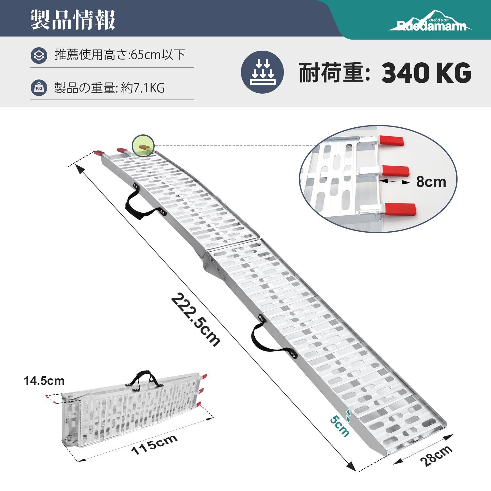 軽量丈夫:材質は軽量化アルミニウム合金で、軽量で高強度です。1本あたりの重量はわずか7.1kgですが、耐荷重は最大340kgあり、安定してご使用いただけます。アルミは強度が高くて、靭性と弾力性が強いので、使用はもっと安定です。また、本バイクラダーのヒンジ部分は一般的な製品より2.5cm長く設計されており、より頑丈で耐久性があります。