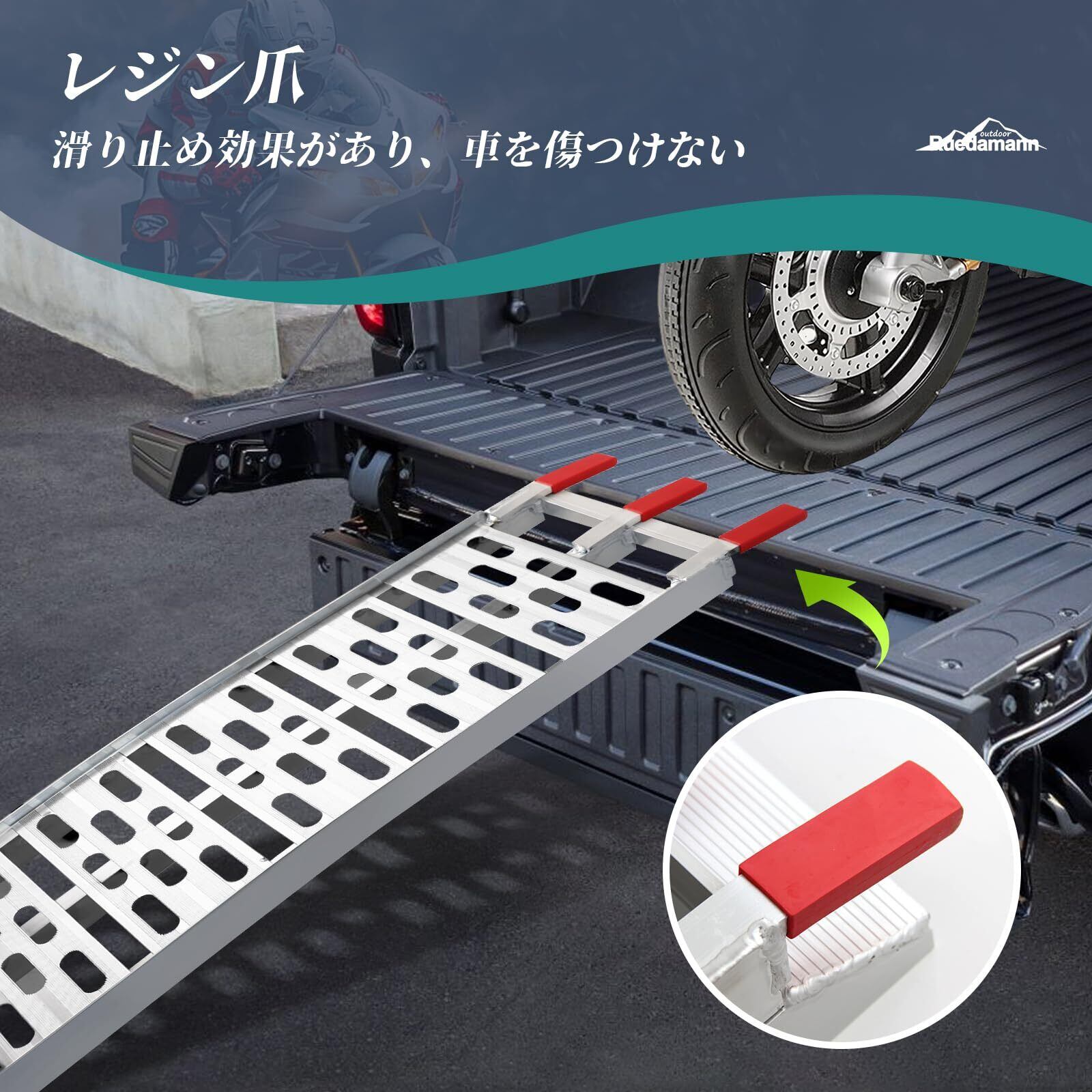 滑り止め:ヘッド部分には赤い滑り止め爪が付いており、設置面にしっかり固定できるため、使用中のズレを防ぎ、車両や床面を保護します。スロープの表面には滑り止めリブ加工が施されており、雨天時や屋外でも優れたグリップ力を発揮します。また、固定用ストラップも付属しており、使用中にバイクラダーレールをしっかり固定できます。