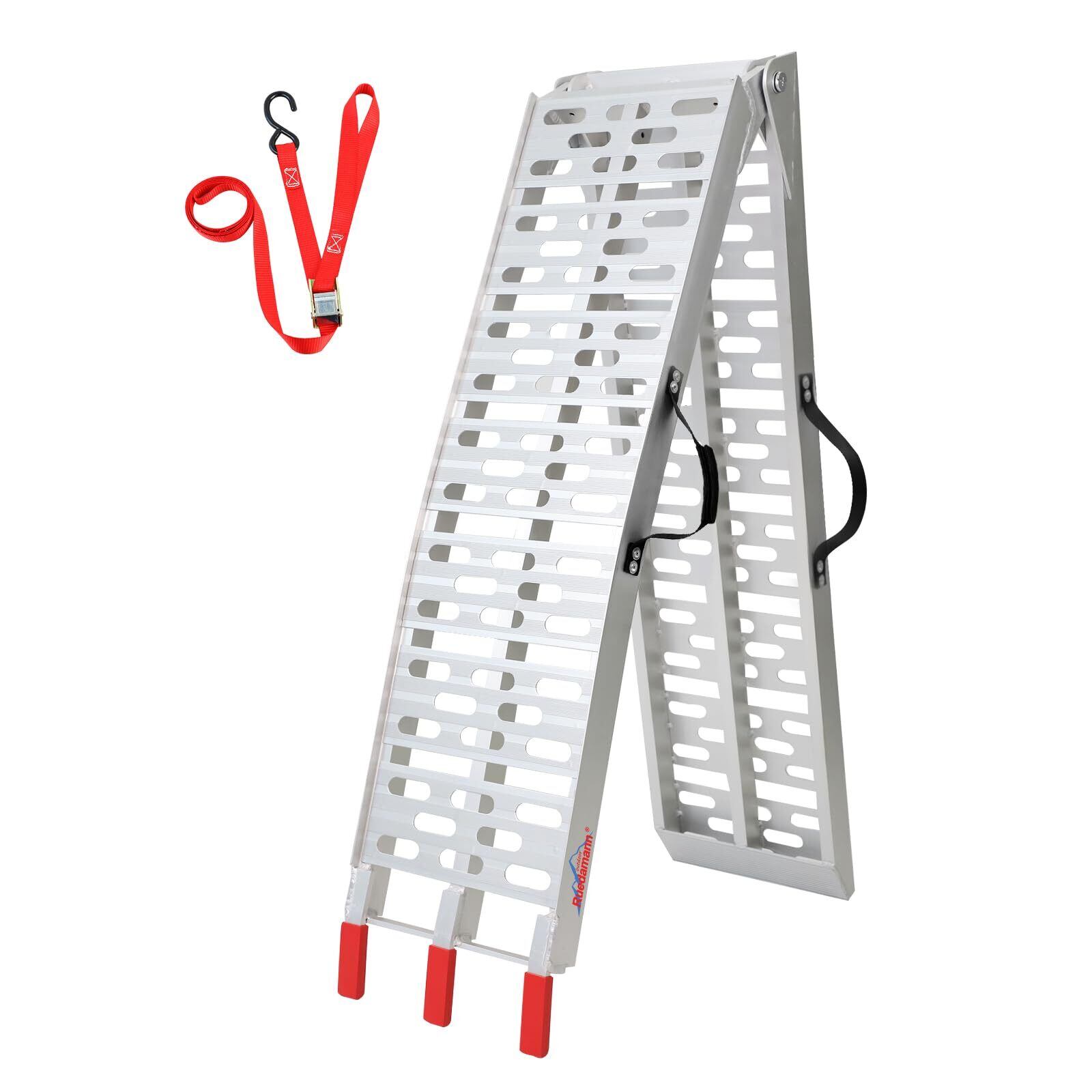 Ruedamann アルミラダーレール 長さ222.5cm 幅28cm 耐荷重340kg 折りたたみ式 ラダーレール 軽量 取っ手付き 滑り止め加工 バイク スロープ ATV四輪バギー 草刈り機 農機具用 軽トラ バン トレーラー ガレージの積み降ろし 1本