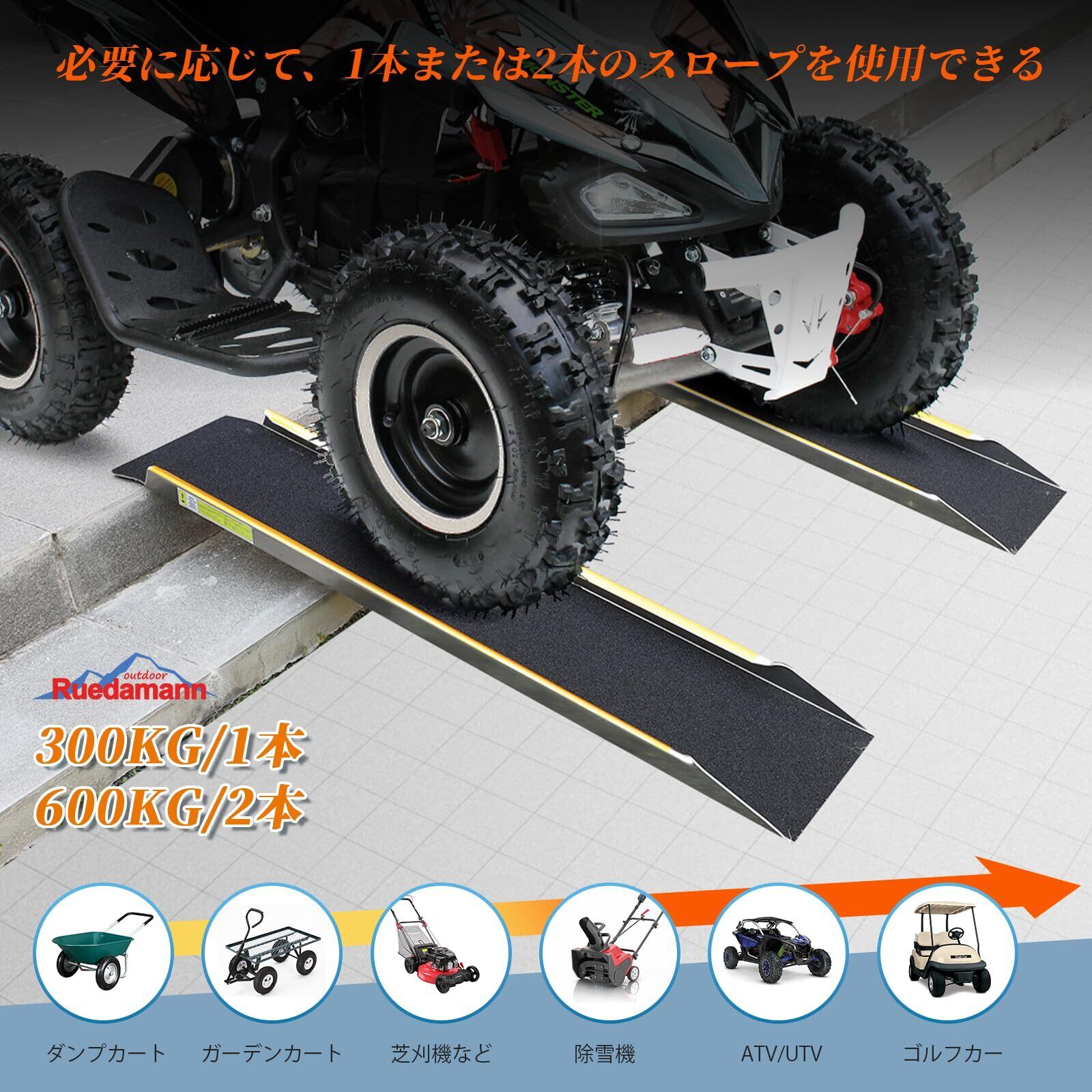 幅広い対応:Ruedamannのバイクラダーは、単本使用時の耐荷重は300kgで、電動自転車やバイクなどの積載車へ積み込む際に使いやすいアルミスロープです。2本併用すると耐荷重は600kgとなり、ATV四輪バギー、草刈り機、薪割り機などの設備を小屋、納屋、ガレージへ積み込むためのアルミラダーレールです。