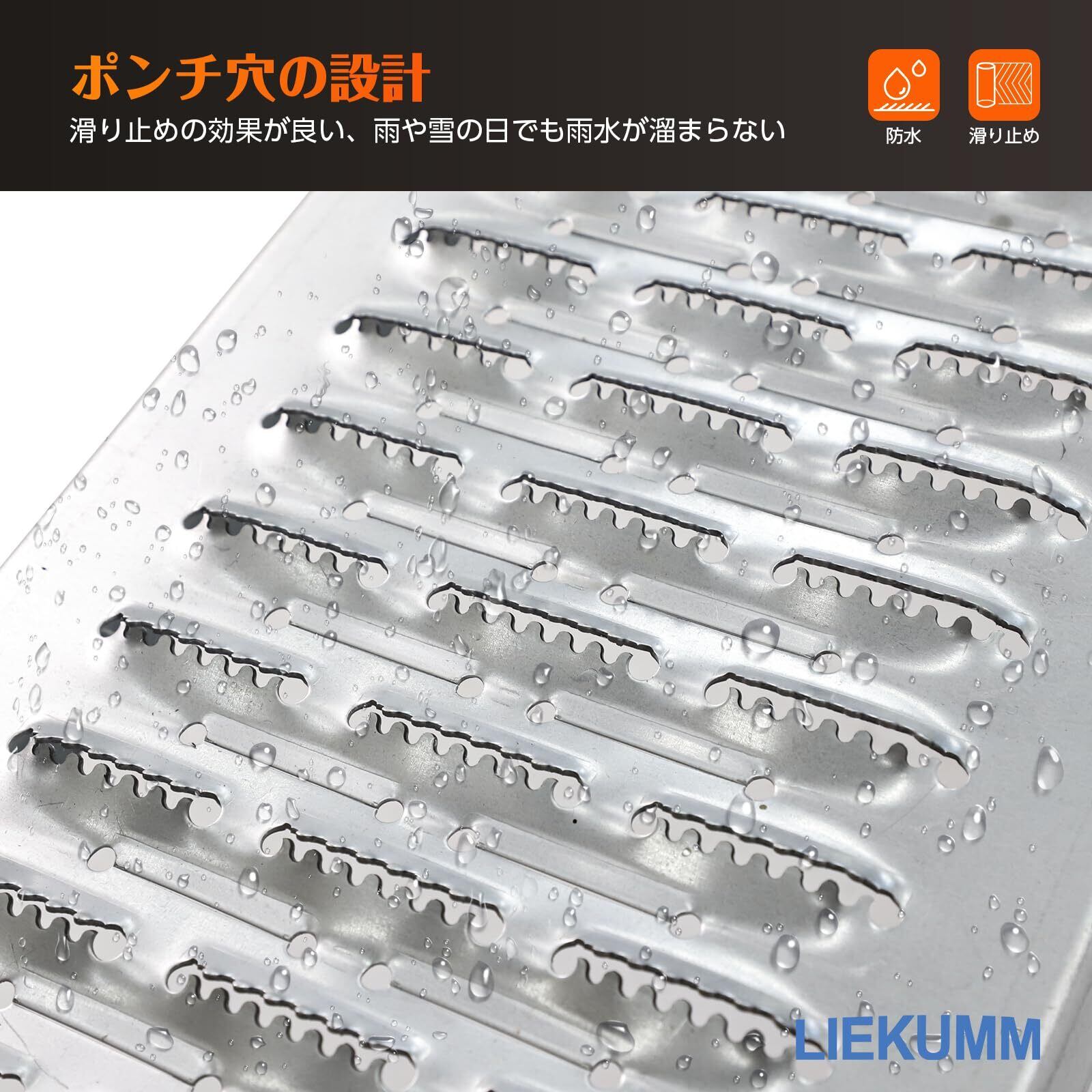 【特別な設計】バイクラダーの表面にポンチ穴がたくさんあり、牽引力がもっと強くて、滑り止めの効き目を果たします。また、雪や雨の日でも雨水がたまりません。それに上部にヘッドプレートが付き、段階や車に置き、積載がもっと安定になります。スロープの底部にある斜面の設計は安定性を高め、滑ることを防ぎます。