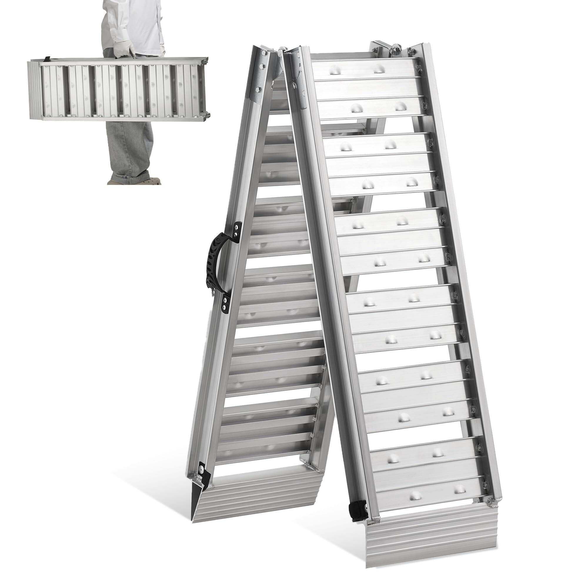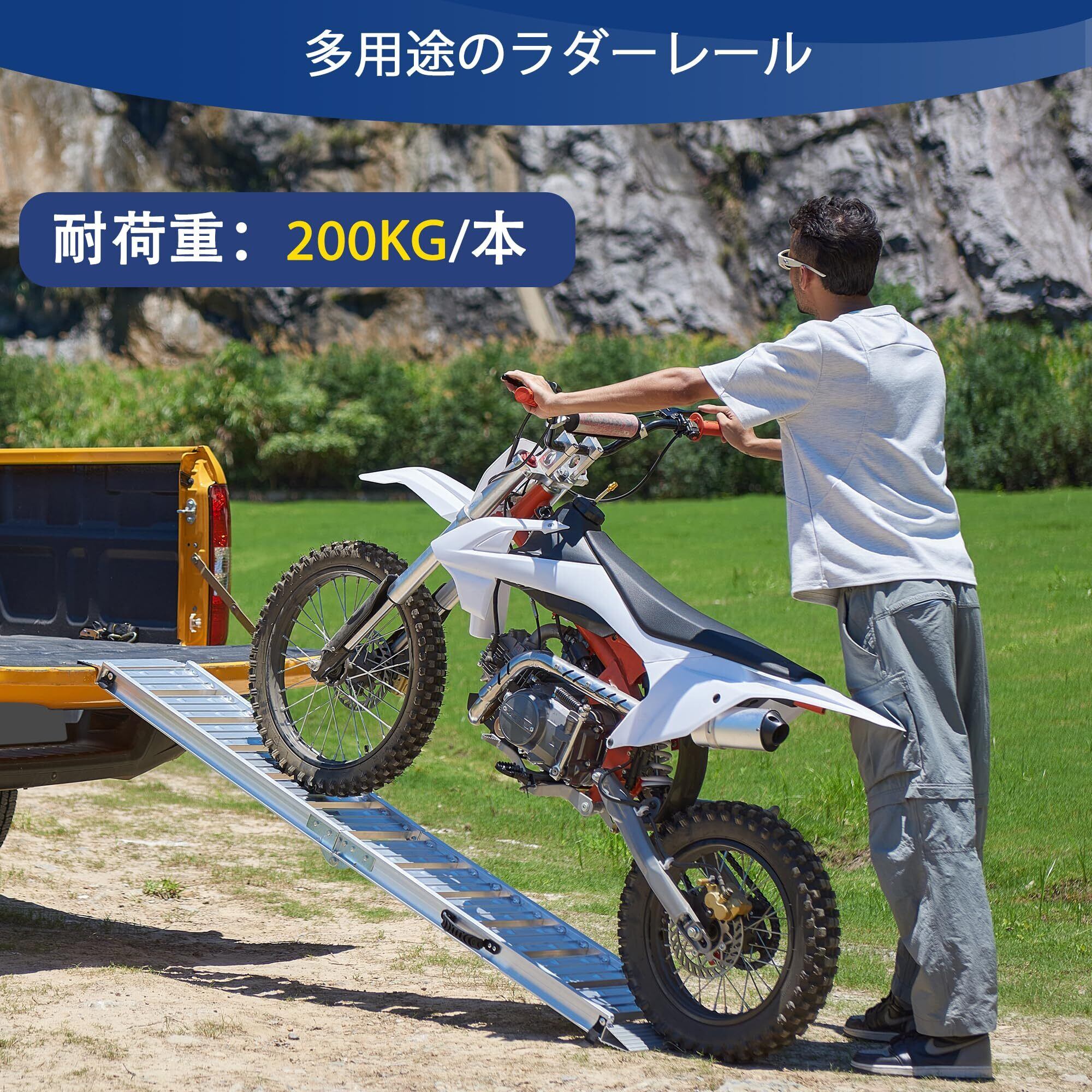 【多用途】使用場合により、スロープを1本/2本自由に選択ください。1本の場合は200kgの荷重でオートバイク、自転車などに適用されます。2本の場合は400kgの荷重で、ATV、草刈り機割草机、四輪車などに適用されます。組立不要で、様々な場所に活躍して、安心、簡単に作業できます。