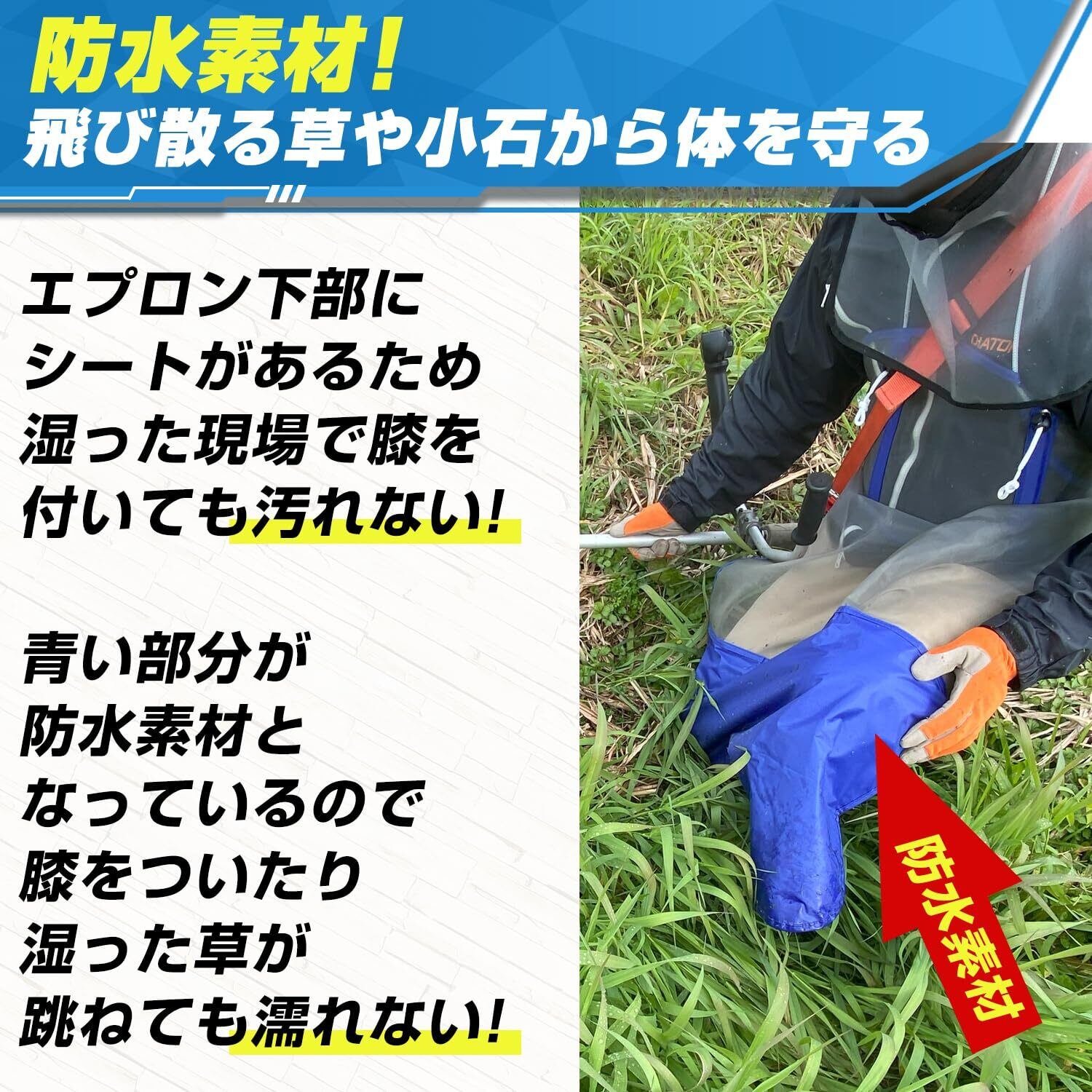 ワンタッチ装着可能な頑丈かつ防水素材の草刈り用エプロンです。 ①丈夫な素材で飛び散る草や小石から体を守る:メッシュ素材で通気性バツグンでありながら丈夫!飛び上が跳ねる草や、木、小石や泥などからしっかり身を守ります! ②ワンタッチで装着可能!腰ベルトがワンタッチ簡単装着:腰ベルトがワンタッチで簡単に装着できるため草刈りの準備がスムーズ! ③エプロン下部にシートがあるため湿った現場で膝を付いても汚れない:青い部分が防水素材となっているので膝をついたり湿った草が跳ねても濡れない! メッシュ素材で通気性バツグン!暑い日でも快適に作業可能! 調節可能な首掛け紐付き:ご自分の体のサイズに合わせてエプロンの高さを調節できるのでどなたでもご利用できる商品となっています。エプロンに飛散した草や土などは水で洗い流してください。※洗濯機では洗わないでください 【本体仕様】 ・草刈り時に使用するアクセサリー(防護防水エプロン)商品となります。 ・本体サイズ:高さ 約120cm(シート部40cm) ×幅 約75cm/本体重量300g 【その他】 ・エプロンに飛散した草や土などは水で洗い流してください。 ※洗濯機では洗わないでください