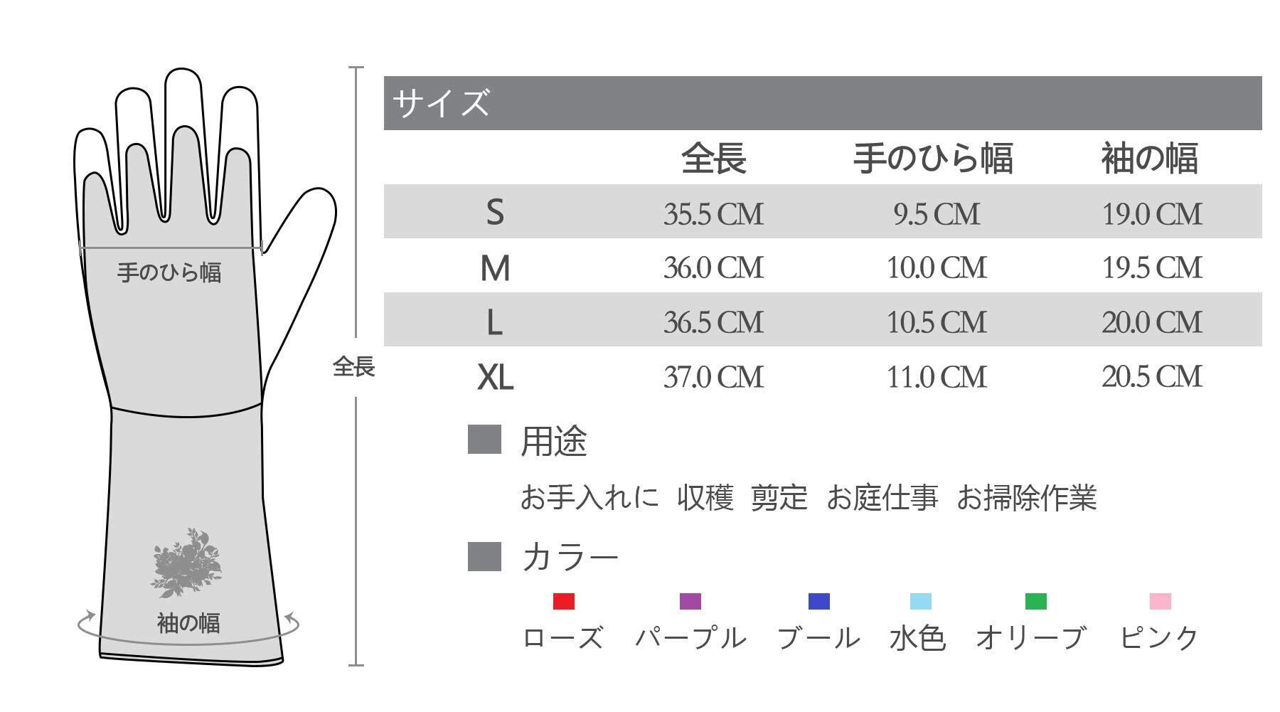 指先と手のひらの部分に合成革が補強され、バラなどの刺や枝の切り口から手を守ってくれます。.全長が35センチ以上の長袖仕様で、腕や肘の部分は刺さりにくいです。