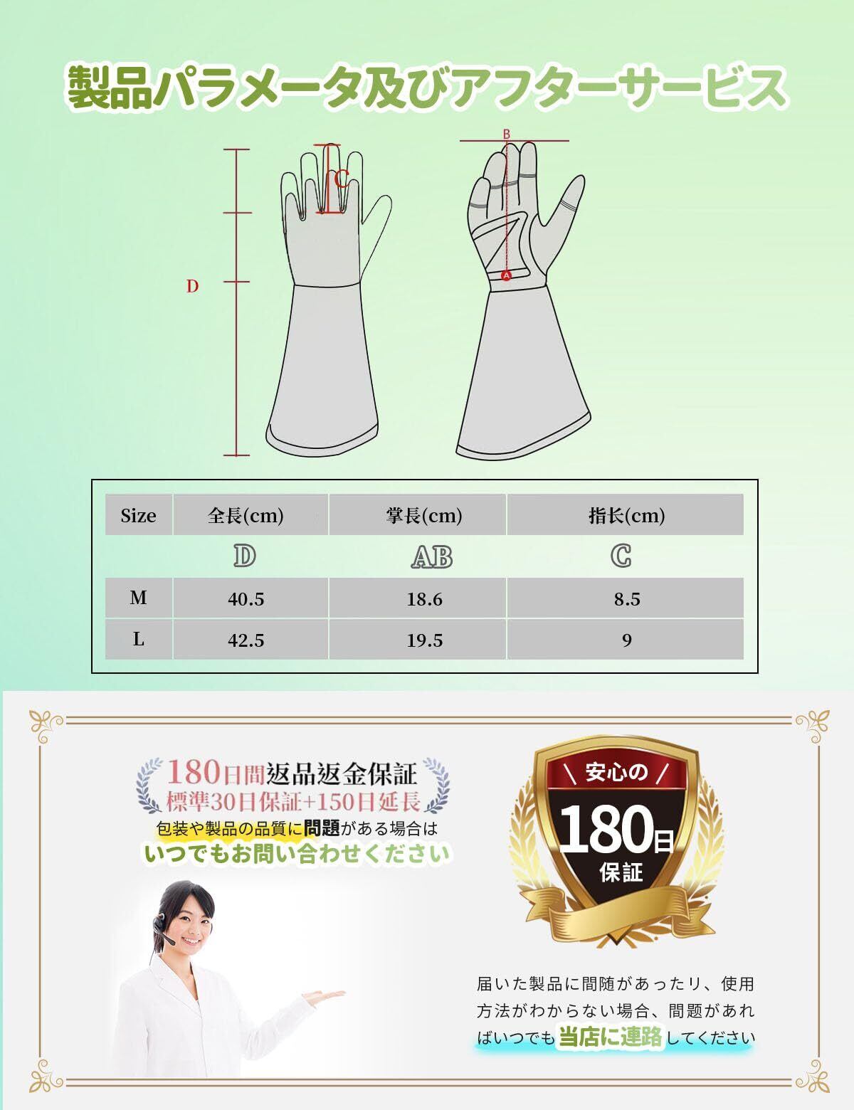 【安心の長袖設計】35cmの長袖で手首から肘までしっかり保護。厚手の服の上からでも楽々着用可能。合成皮革を使用した指先と手のひら部分が、バラの棘や枝から肌を守ります。園芸用手袋として剪定や畑作業にも幅広く活用可能。