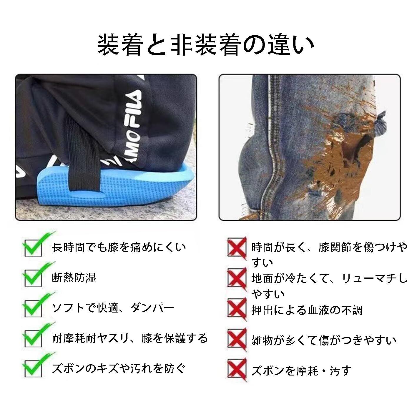 【こうしつざいりょう】:膝当ては高品質EVA材料で作られ、優れた強度と耐久性を持ち、長時間の使用中に信頼性の高いパフォーマンスを提供し、膝を永続的に保護することができます。
