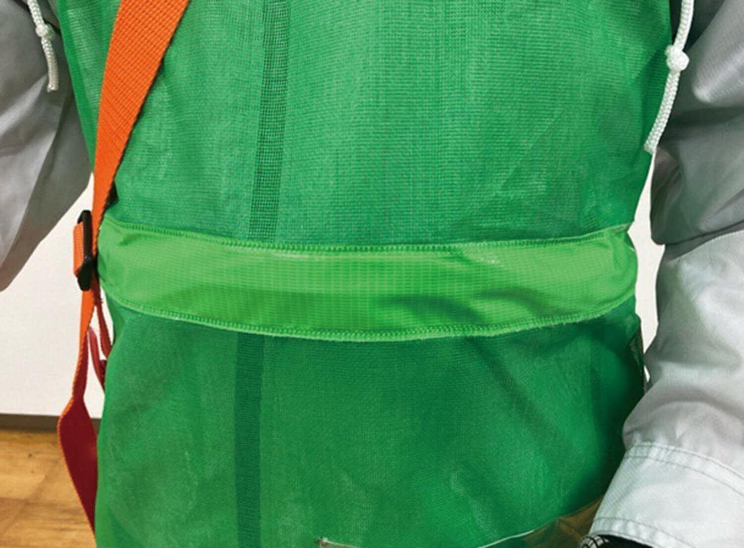特徴1:腰ベルトにはバネが入っているため、ワンタッチで腰へ固定でき、メッシュタイプのため夏場の作業も快適