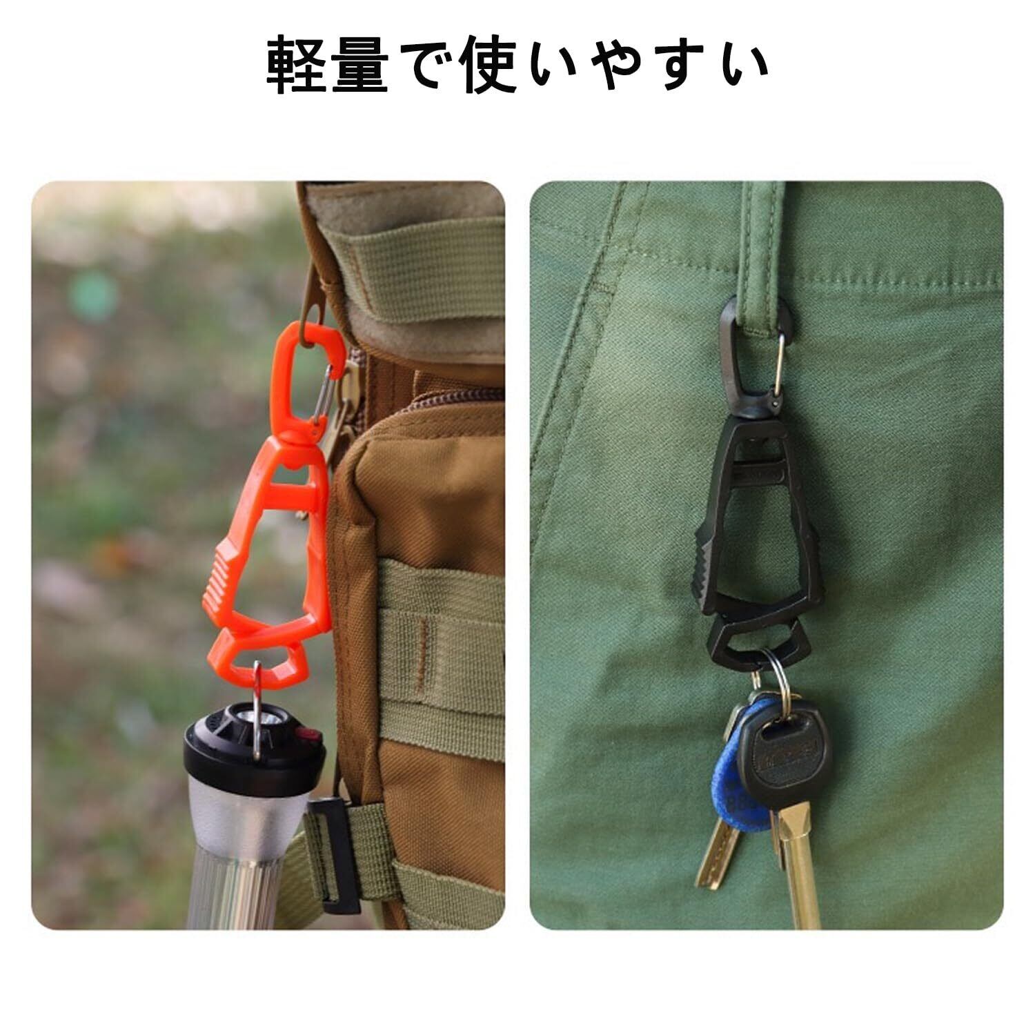 主な材質:改良型カラビナ、アルミニウム合金採用、ABSクリップ。高強度、軽量、屋外使用耐久性、耐摩耗性、耐食性。