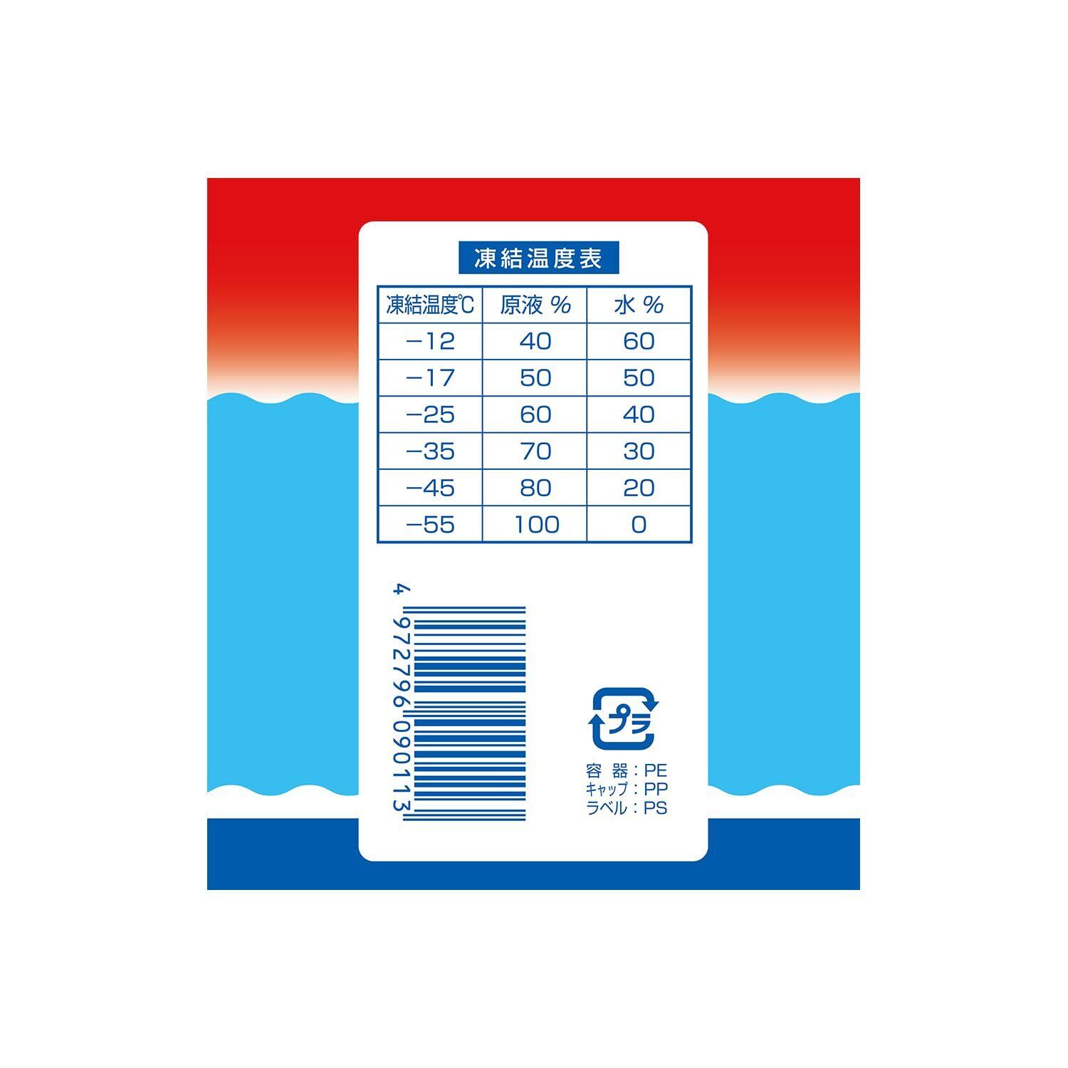 化粧品にも使用されている毒性の少ない、グリセリン・エタノールが主成分。希釈により-10℃~-55℃まで対応します。金属防錆性能があり、ゴムやプラスチックに対しても悪影響がありません。