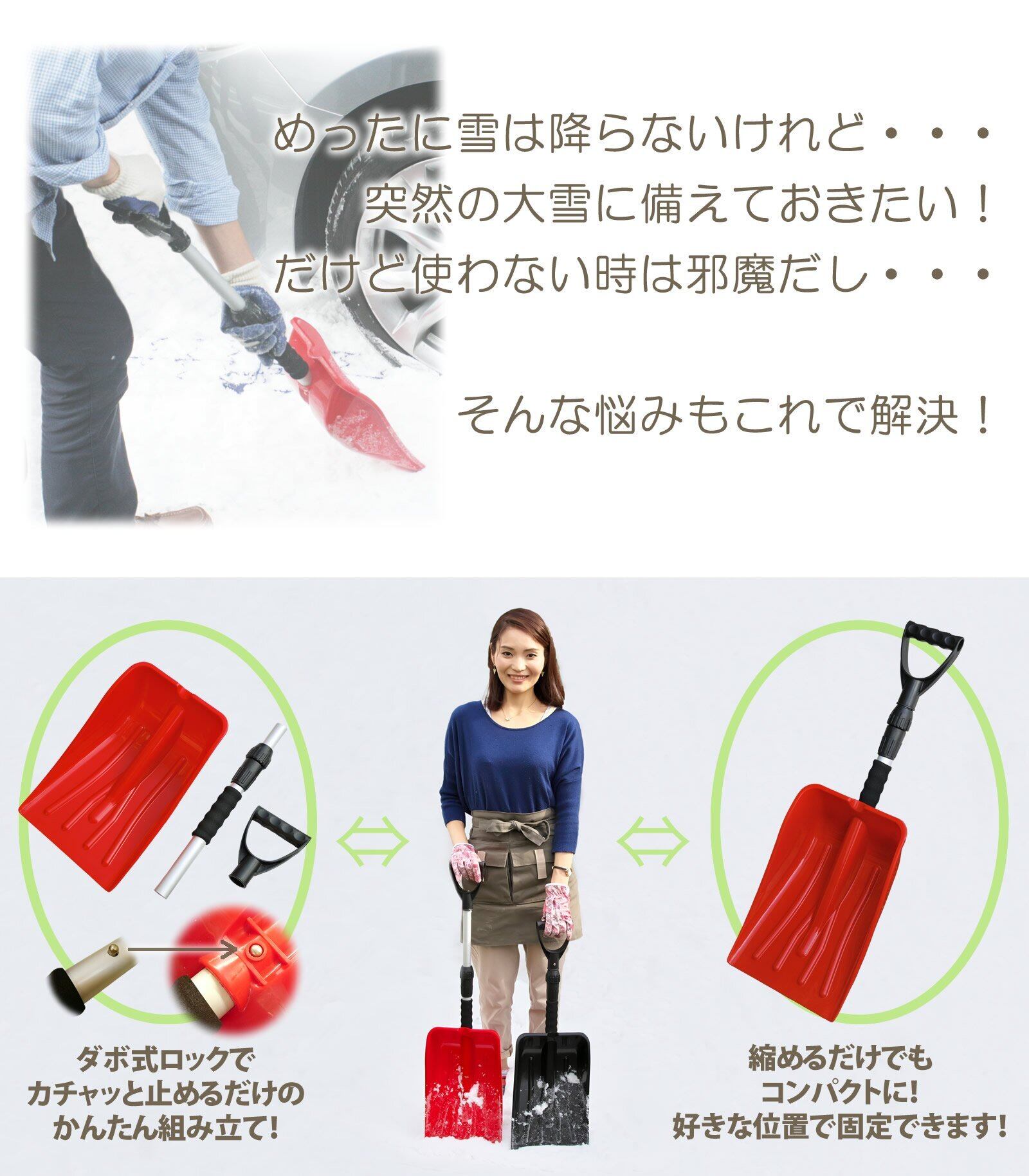 突然の雪に!冬のレジャーに!コンパクトで組み立てかんたん!伸縮式の軽量スノーショベルです。すくいやすいよう深めに形成したポリプロピレン製のスコップにアルミ製の柄を採用!軽量シャベルで持ち運びに便利!作業の負担も軽減します。専用パッケージ入りで収納もコンパクト。長さは約71~88cmの範囲で調節が可能です。めったに雪は降らないけれど・・・突然の大雪に備えておきたい!だけど使わない時は邪魔だし・・・そんな悩みもこれで解決!短くしたままでも使えるので背の低い方やお子さまにもオススメです!分解も可能なので車載用としてもGOOD!