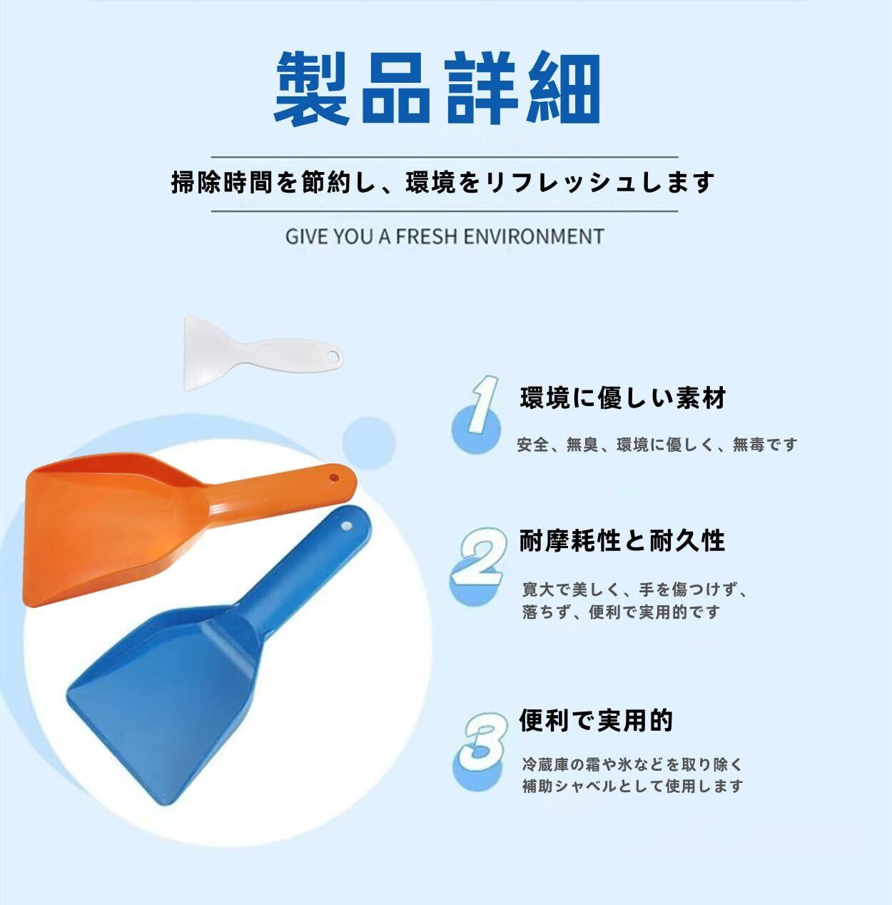 【プレミアム品質 】冷蔵庫用アイスシャベルは、高品質な食品グレードのプラスチック素材で作られており、エコフレンドリーで無臭、丈夫で壊れにくく、長期間使用できます。