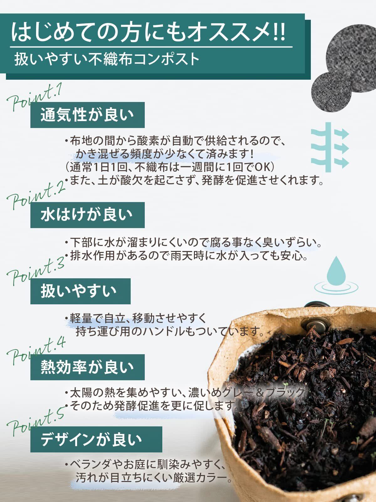 【不織布生地のメリット】 プラスチック製と比べて通気性・排水性に優れており、発酵がスムーズに進みます。余分な湿気を逃がすことで臭いやカビを防ぎ、快適に長く使用できます。また軽くて柔らかいので持ち運びや収納も簡単です。