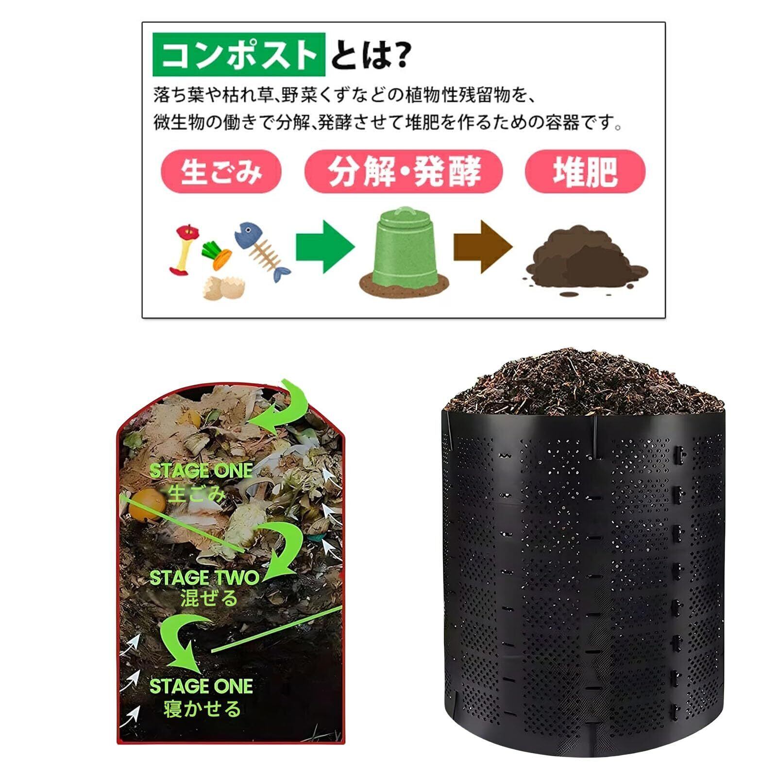 【再利用可能】堆肥化が完了したら、簡単に分解して再利用することができ、必要な場所で再び堆肥作りを行うことが可能です。再利用することで、環境に優しく、菜園や庭に栄養豊富な土壌を提供します。