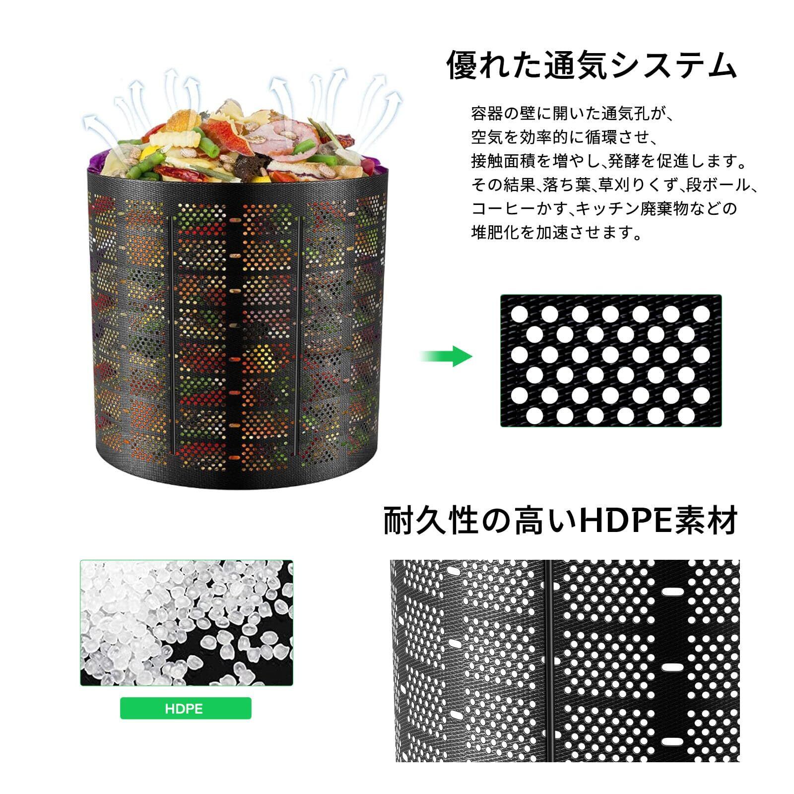 【優れた通気システム】容器の壁に開いた通気孔が、空気を効率的に循環させ、接触面積を増やし、発酵を促進します。その結果、落ち葉、草刈りくず、段ボール、コーヒーかす、キッチン廃棄物などの堆肥化を加速させます。