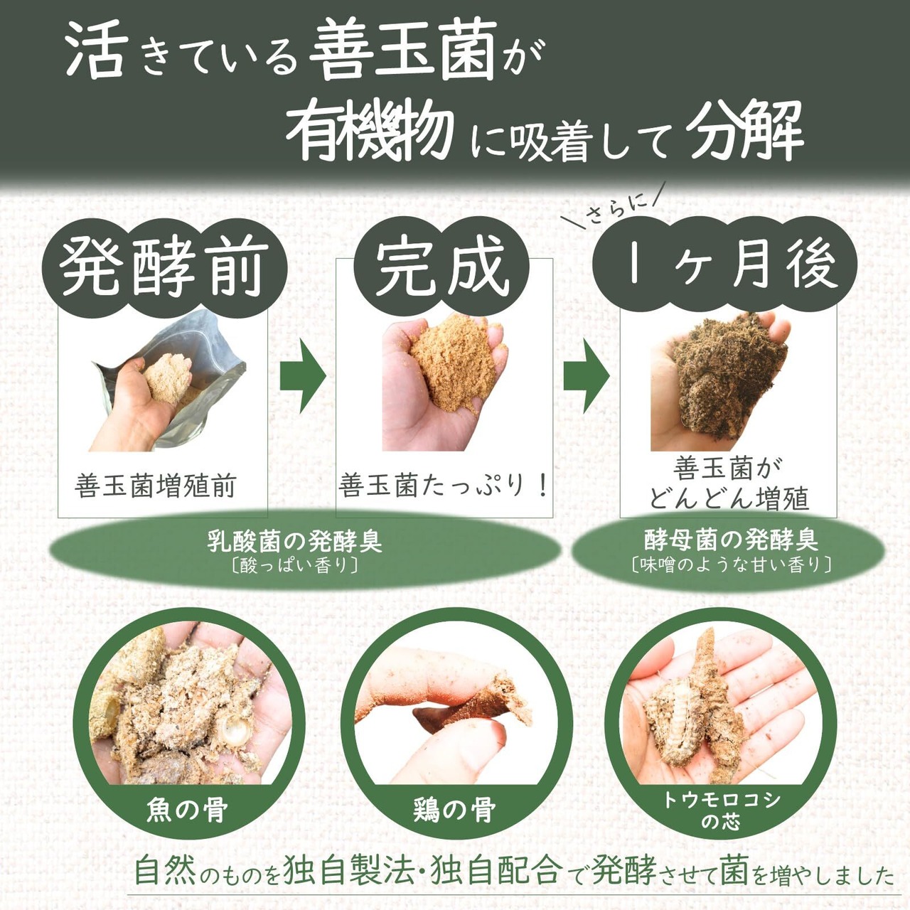 発酵熱による発酵促進: コンポストに入れるとわずか数日で発酵熱が上がります。生ゴミ等の有機物にしっかり吸着するので分解が早く、熱くなり害虫が寄ってこず、雑草の種を熱処理します。コンポスト初心者や虫が苦手な方へおすすめです。